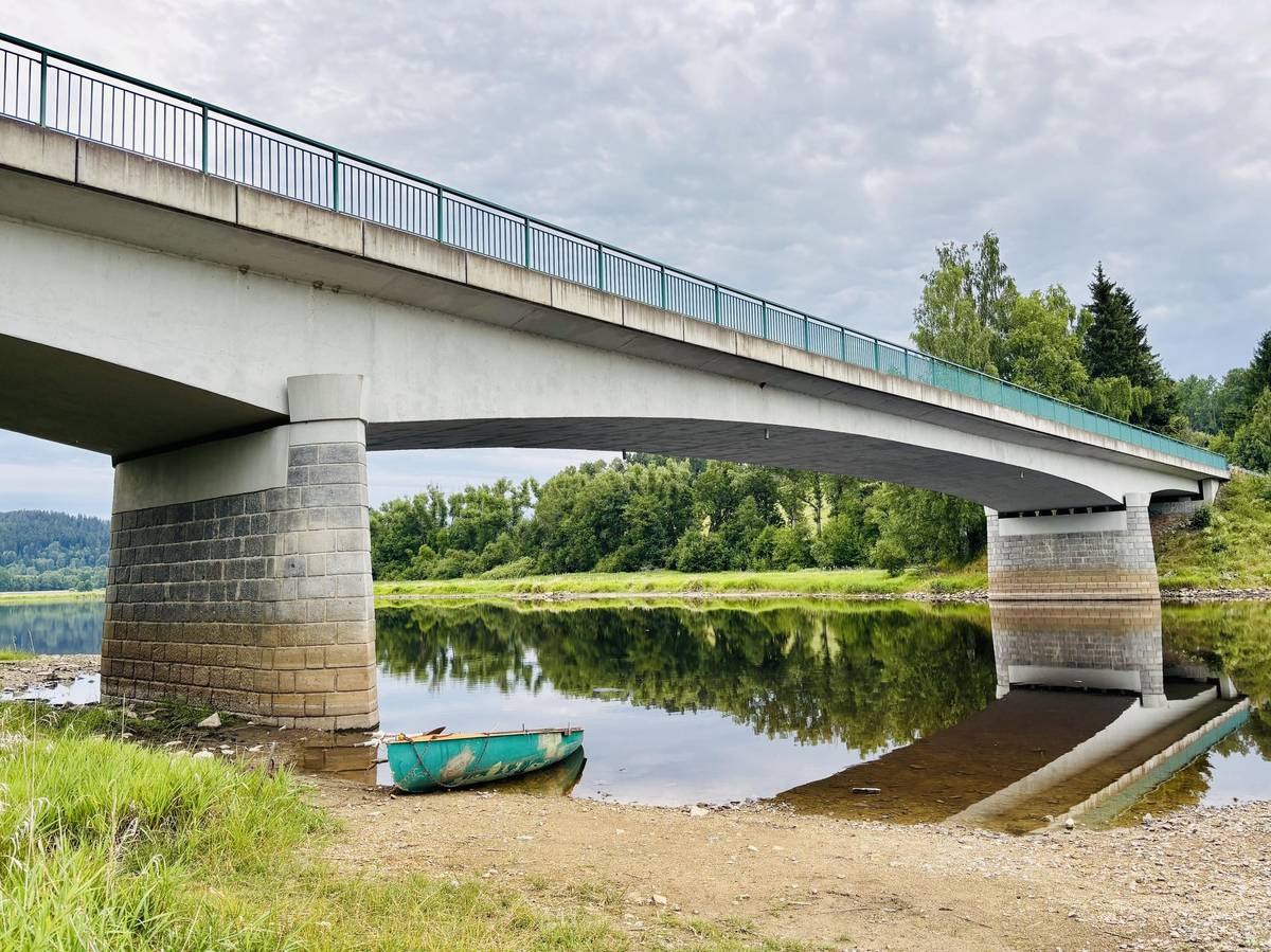 Most u Nové Pece v místech, kde se Vltava vlévá do vodní nádrže Lipno.