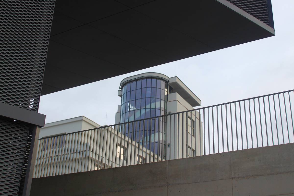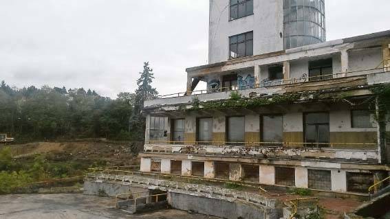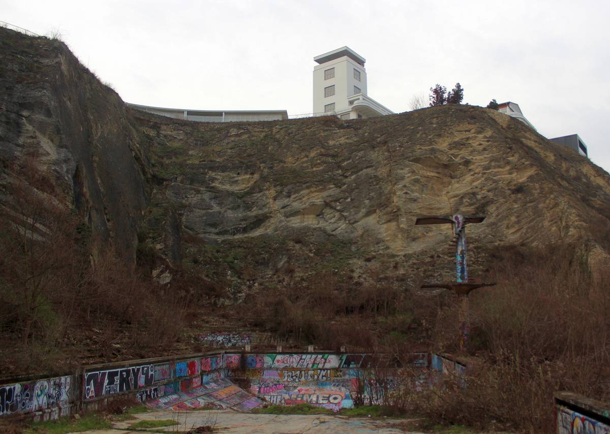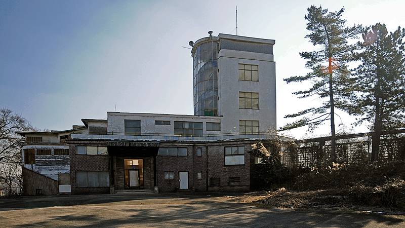 Pohled z někdejšího bazénu na vyhlídkovou věž a skokanský můstek.