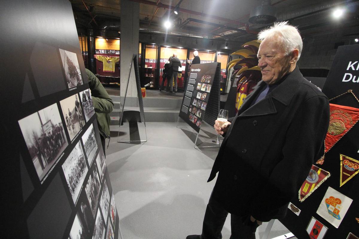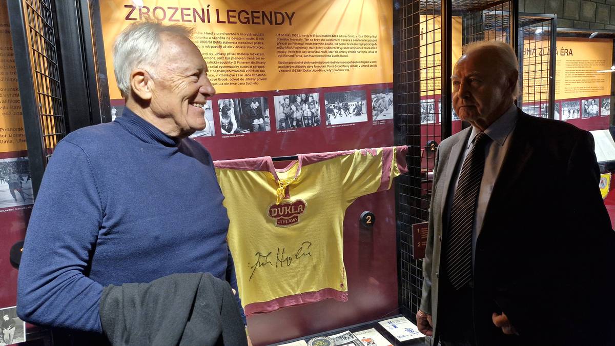 Jeden z nejlepších hokejistů v historii Dukly Jihlavy Jiří Holík si prohlíží klubovou Síň slávy v nové Horácké aréně