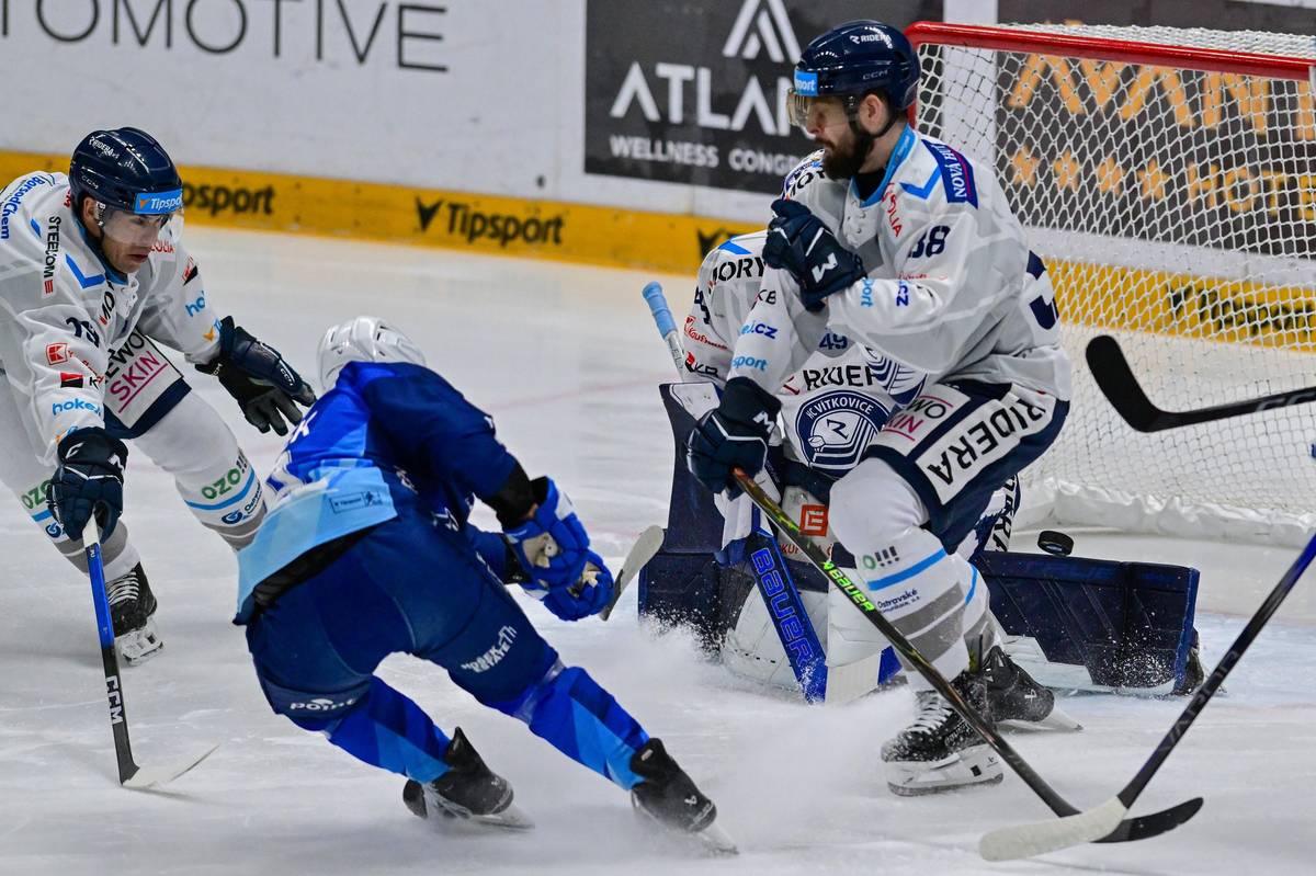 <p>Utkání 19. kola hokejové extraligy: HC Vítkovice Ridera - HC Sparta Praha, 29. října 2025, Ostrava. Zleva Jani Lajunen ze Sparty, Michal Řepík ze Sparty, Krzysztof Maciaś z Vítkovic a Vojtěch Port z Vítkovic. </p>