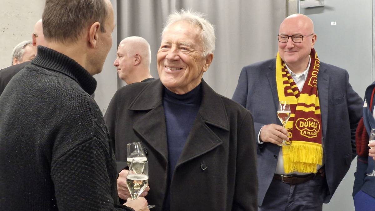 Jiří Holík v rozhovoru s primátorem Petrem Ryškou při otevření síně slávy Dukly Jihlava. V pozadí s šálou nový většinový vlastník klubu Slavomír Pavlíček