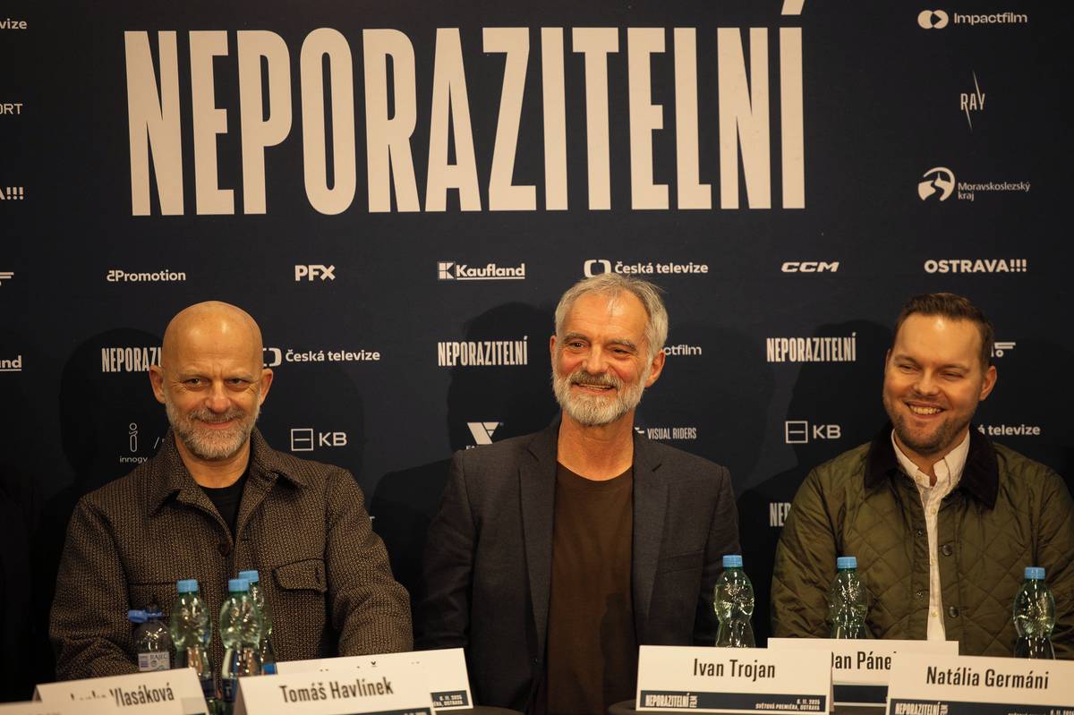 Tisková konference - zleva herci Hynek Čermák a Ivan Trojan, vpravo režisér Dan Pánek