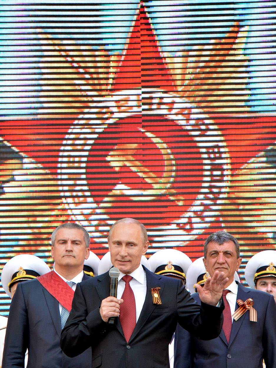 Ruský prezident hovoří během své návštěvy krymského přístavu Sevastopol 9. května 2014. V březnu 2014 byl Krym připojen k Ruské federaci.