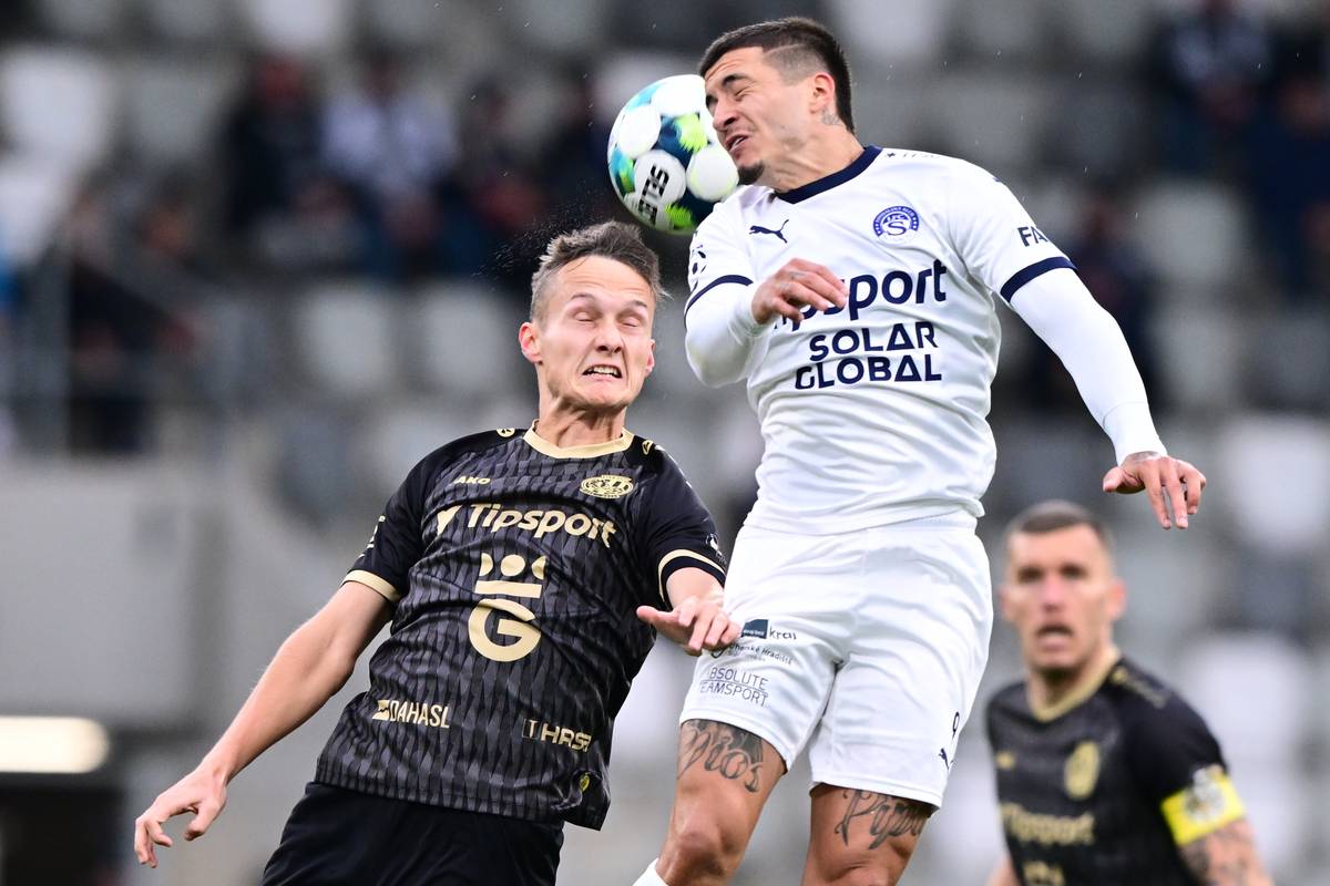 Hlavička Aleše Čermáka, kterého brání Marián Pišoja ze Zlína