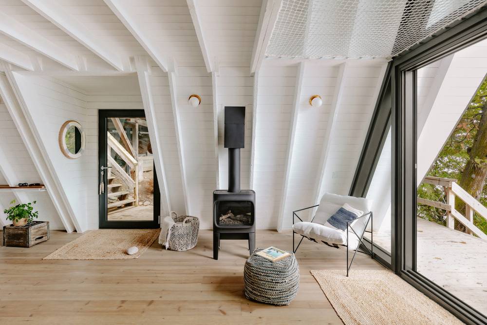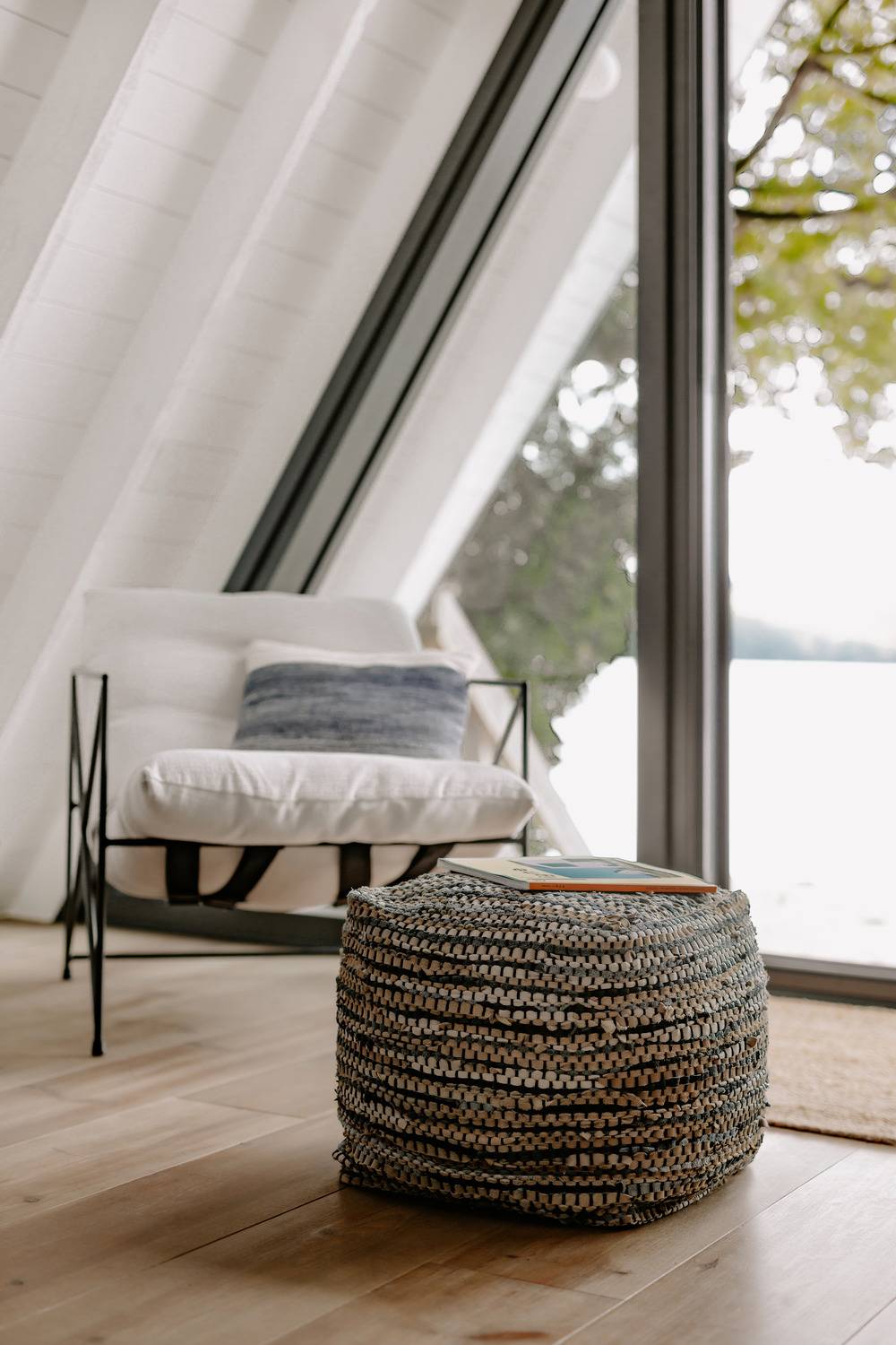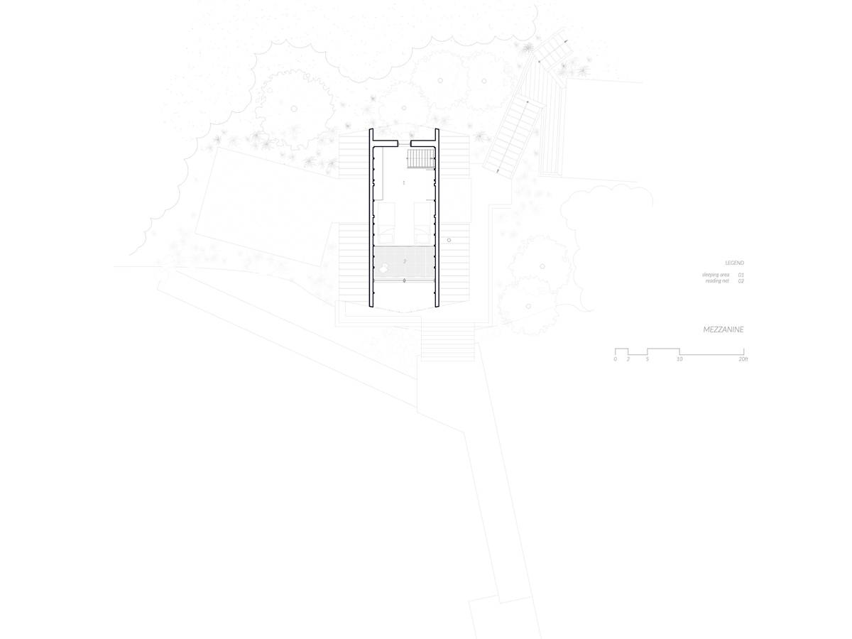 V mezaninu je ložnice se sítí, jíž lze rovněž využít k odpočinku.