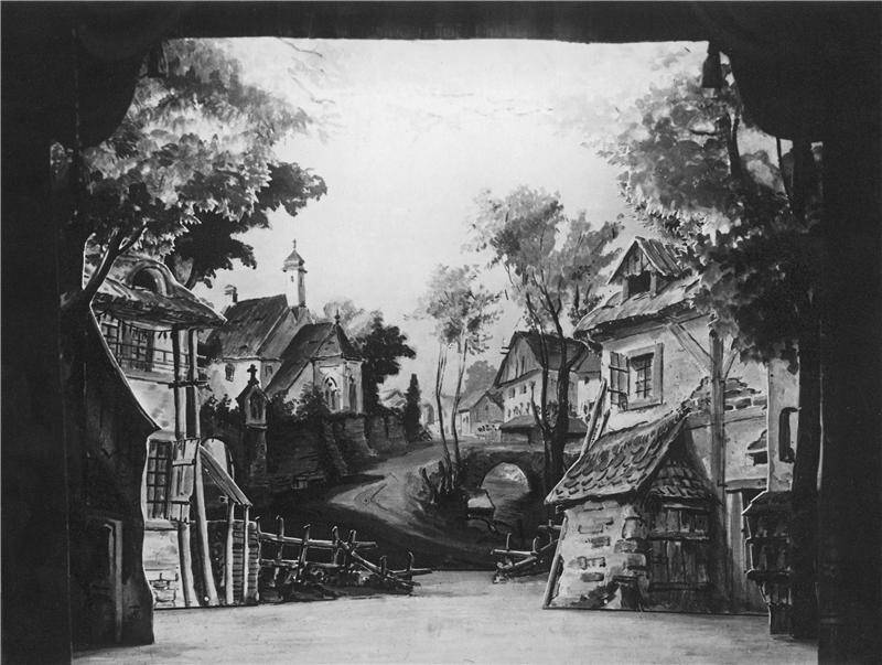 Scéna pro první jednání Prodané nevěsty v Národním divadle v roce 1883.