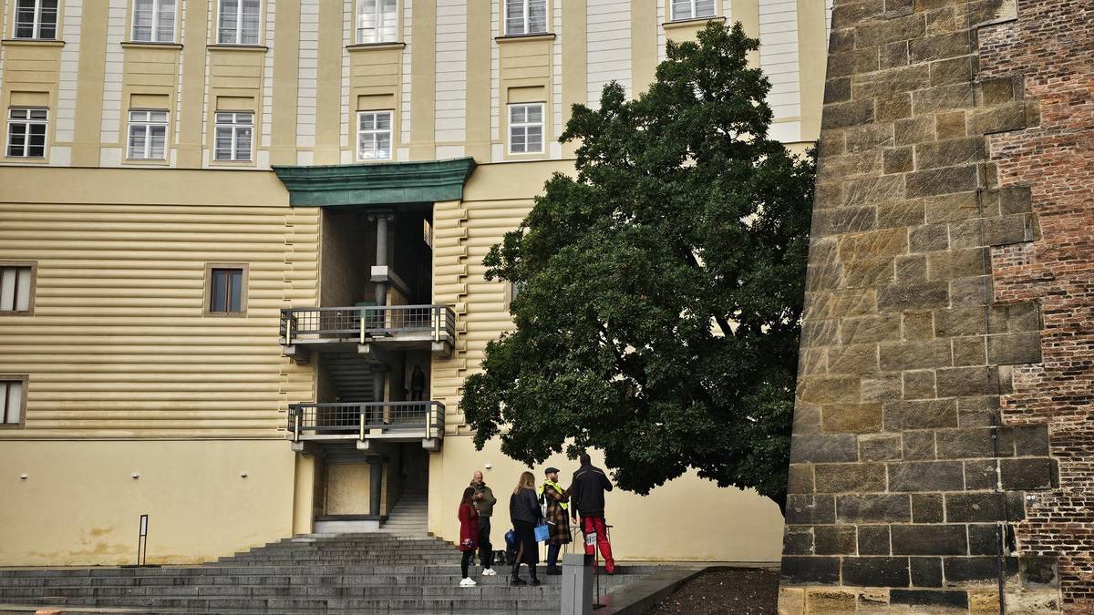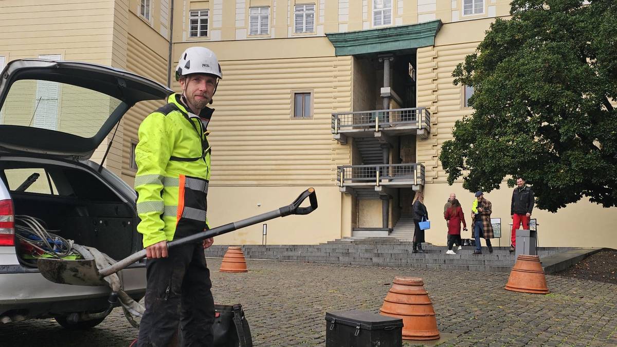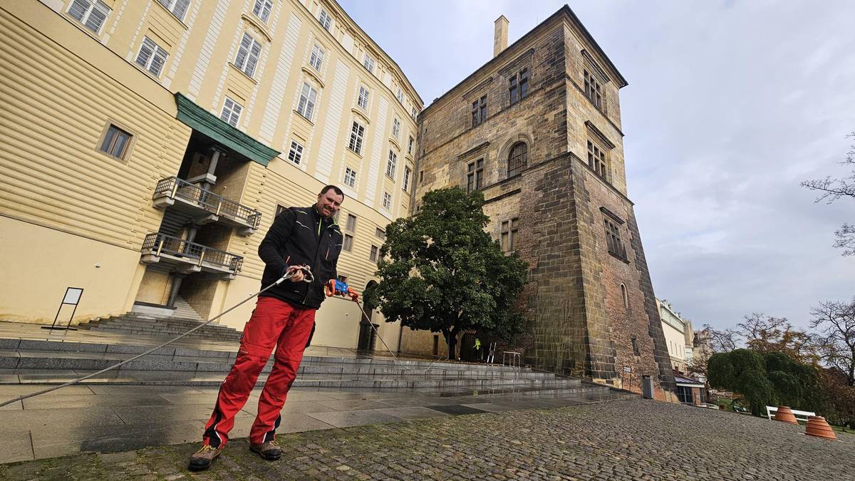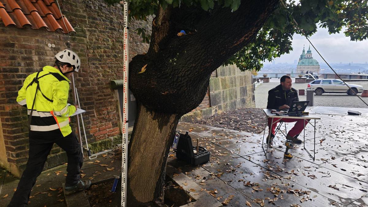 Arboristé v akci při měření odolnosti stálezeleného dubu u Býčího schodiště Pražského hradu.