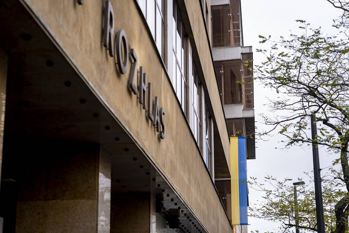 Ústřední budova Městské knihovny v Praze, tady je vlajka Ukrajiny stále k vidění.