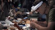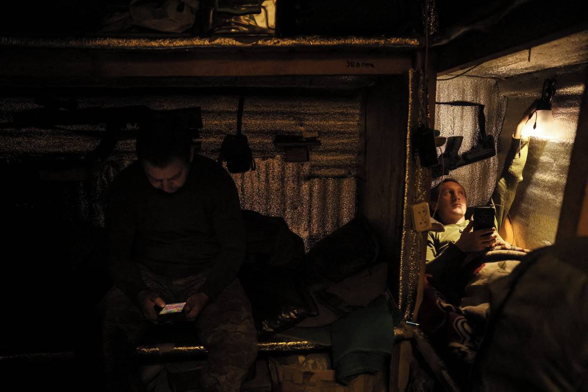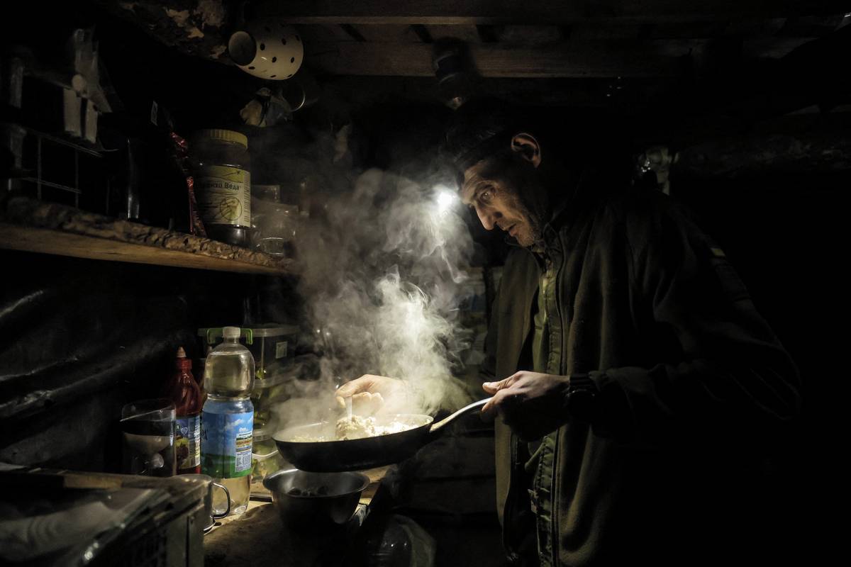 Voják 24. mechanizované brigády ukrajinských ozbrojených sil připravuje jídlo v zákopu poblíž města Časiv Jar v Doněcké oblasti, 25. října. Vojáci se v současnosti často skrývají pod zemí, protože tam je nemůžou ohrozit drony.