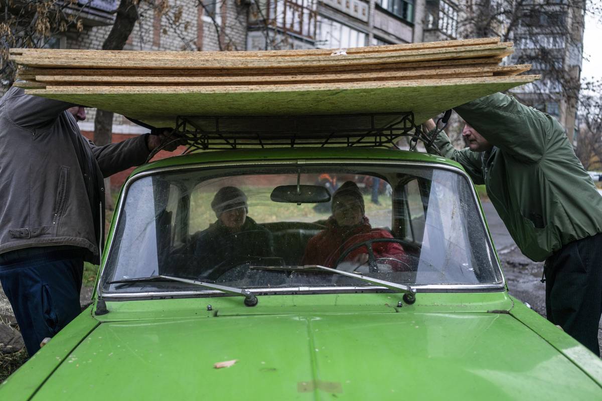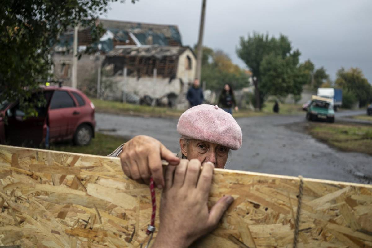 Lidé připravují opravy svých domů po ruském leteckém útoku na Kramatorsk, 9. října. Kramatorsk a Slovjansk jsou posledními dvěma většími městy v Doněcké oblasti, která nejsou pod ruskou kontrolou ani nejsou bezprostředně ohrožena pozemním útokem.