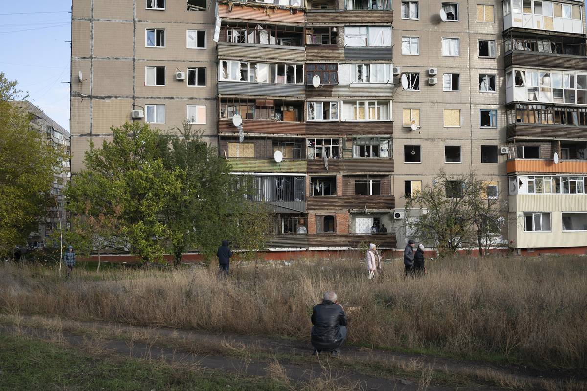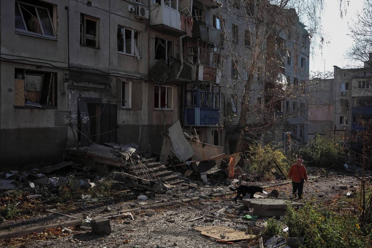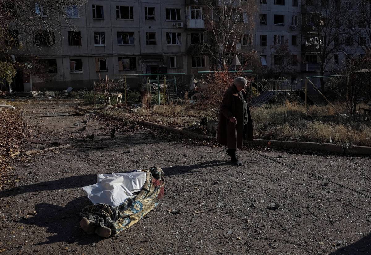 Žena z Kosťantynivky, kde žilo v roce 2012 zhruba 77 tisíc obyvatel, prochází kolem těla své sousedky před bytovým domem poškozeným ruským vojenským útokem, 3. listopadu 2025.