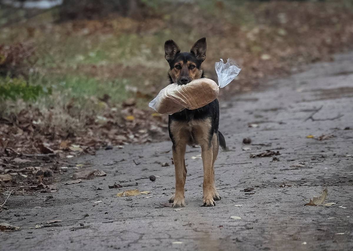 Toulavý pes drží v tlamě sáček s chlebem, Kosťantynivka, 1. listopadu.