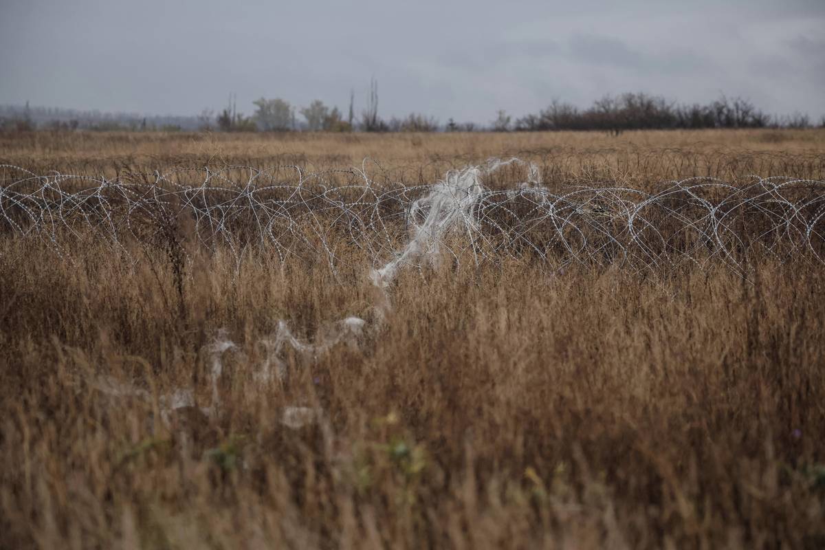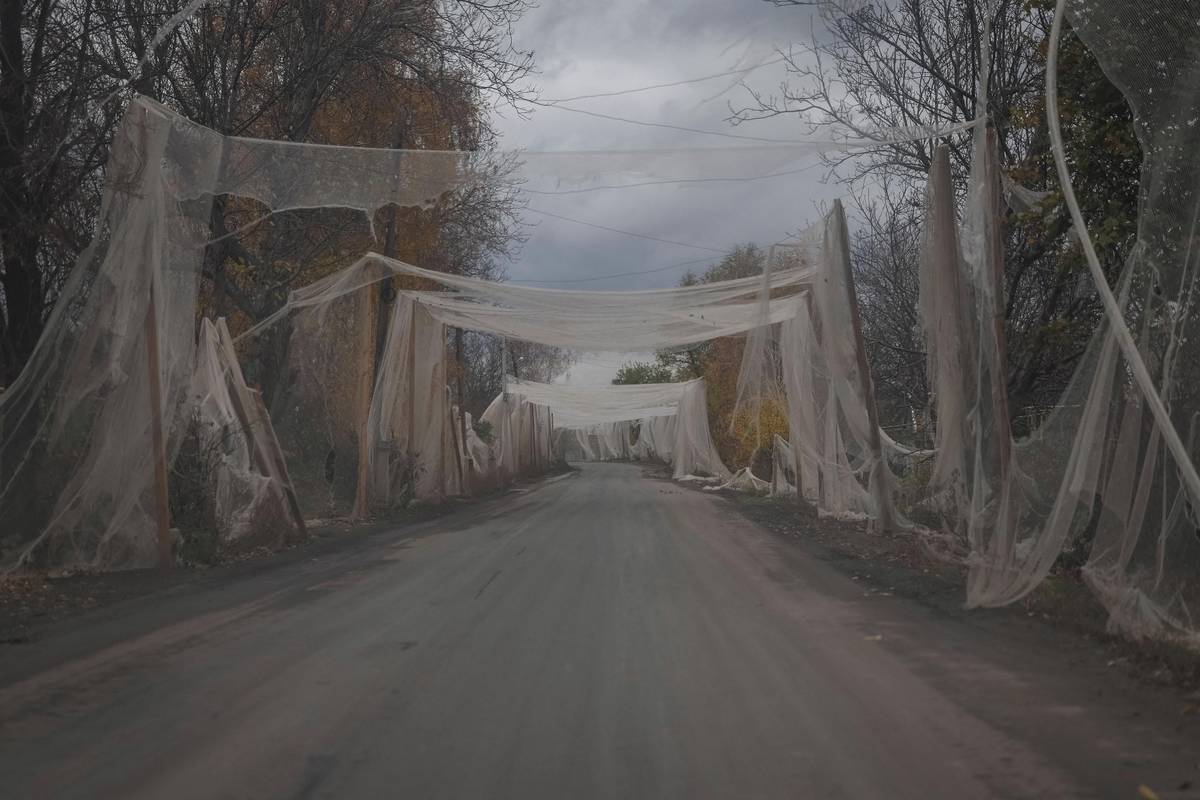 Sítě proti dronům nad silnicí v Kosťantynivce, 1. listopadu. Podobné se už měsíce instalují i v dalších regionech. Drony různých velikostí jsou nejrozšířenější zbraní války. Rusko často menší letouny nasazuje k pronásledování civilistů.