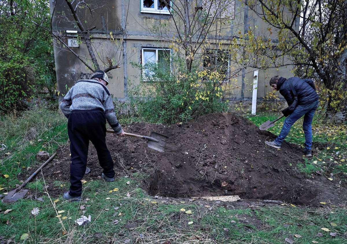 Lidé pohřbívají svého souseda poblíž bytového domu poškozeného ruským vojenským útokem, Kosťantynivka, 1. listopadu.