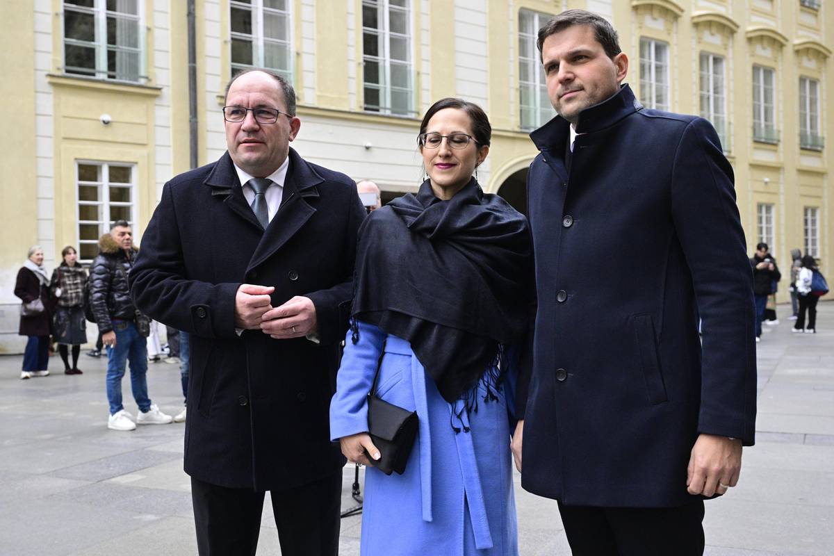Příchod vítězů říjnových voleb. Na snímku Andrej Babiš, v pozadí Karel Havlíček a Alena Schillerová.