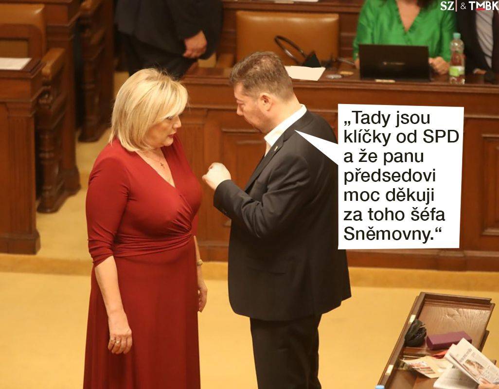 TMBK: Okamura poslal Babišovi dárek za křeslo ve vedení Sněmovny