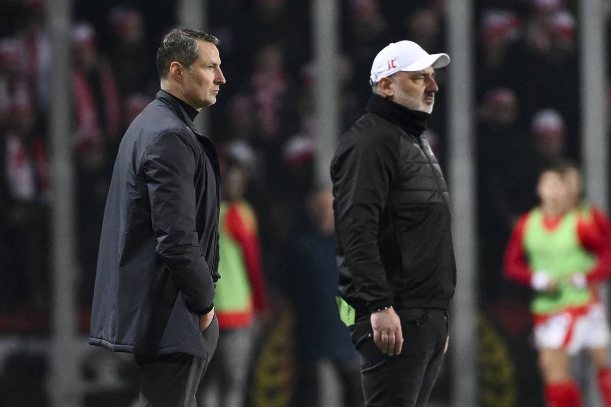 Zleva trenér Sparty Brian Priske a trenér Slavie Jindřich Trpišovský