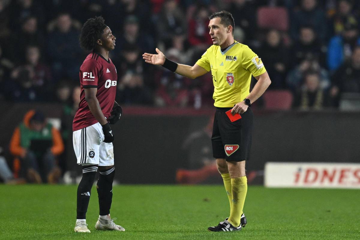 Rozhodčí Ondřej Pechanec tasí červenou kartu pro Angela Preciada