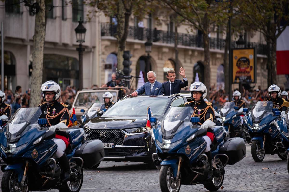 Kromě Peugeotu jezdí prezident i DS 7 Crossback, toto je auto, které využil při své inauguraci po prvním zvolení v roce 2017. Na fotce při návštěvě britského krále Karla III.