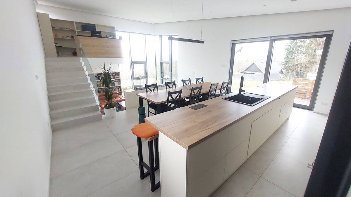 Jídelna a galerie jsou zařízeny převážně ve světlých tónech.