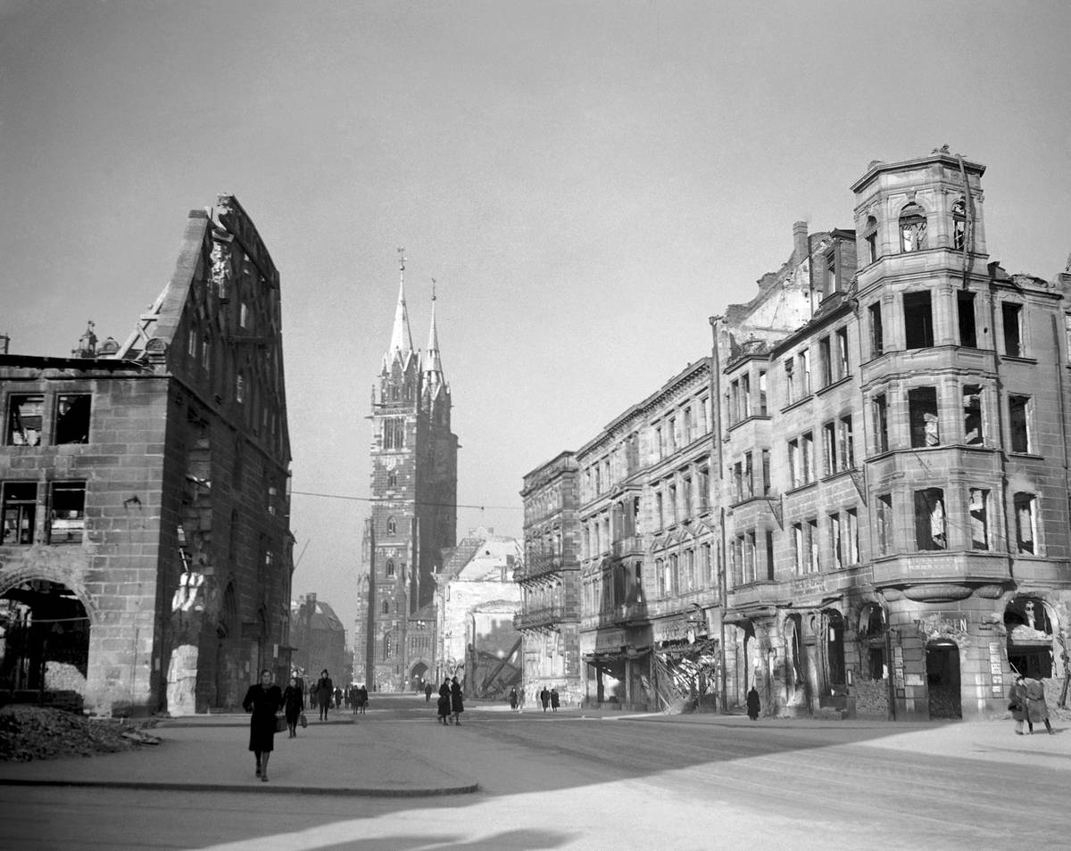 Obecný pohled do soudní síně v Justičním paláci v Norimberku, kde si obžalovaní vyslechli části rozsudku, který předčítal Mezinárodní vojenský tribunál, 30. září 1946.