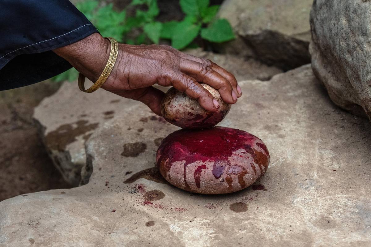 Vyskytují se v suchých, nízko položených oblastech ostrova, rostou pomalu a zřídka rodí plody nebo kvetou. (Žena ukazuje, jak se drtí míza ze stromu Dračince rumělkového.)