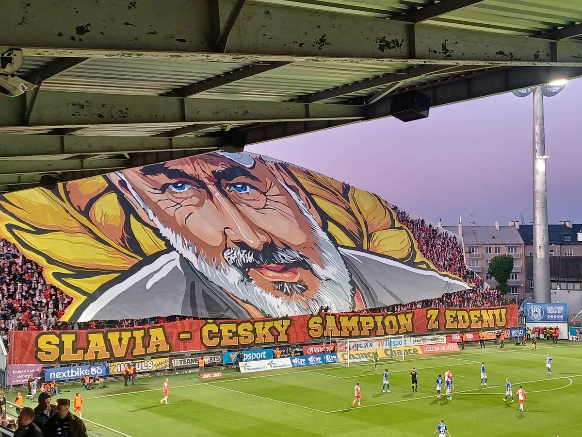 Obří choreo fanoušků Slavie s obličejem trenéra Jindřicha Trpišovského.