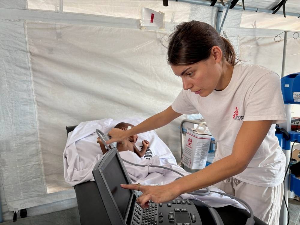 Pediatrička Lékařů bez hranic Giulia Chioprisová pečuje o akutně podvyživeného Abdula Mazina Mahmouda v nemocnici v Tavíle.