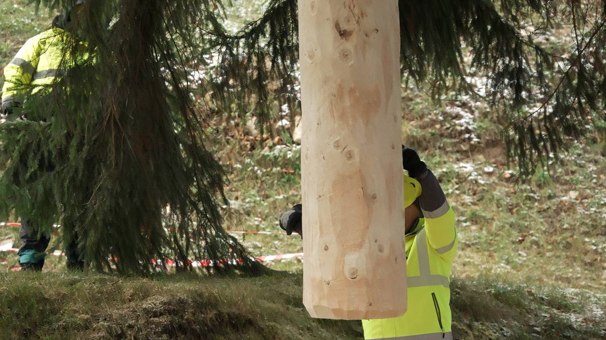 Dřevorubci museli strom ořezat tak, aby se mohl postavit do šachty na Staroměstském náměstí.