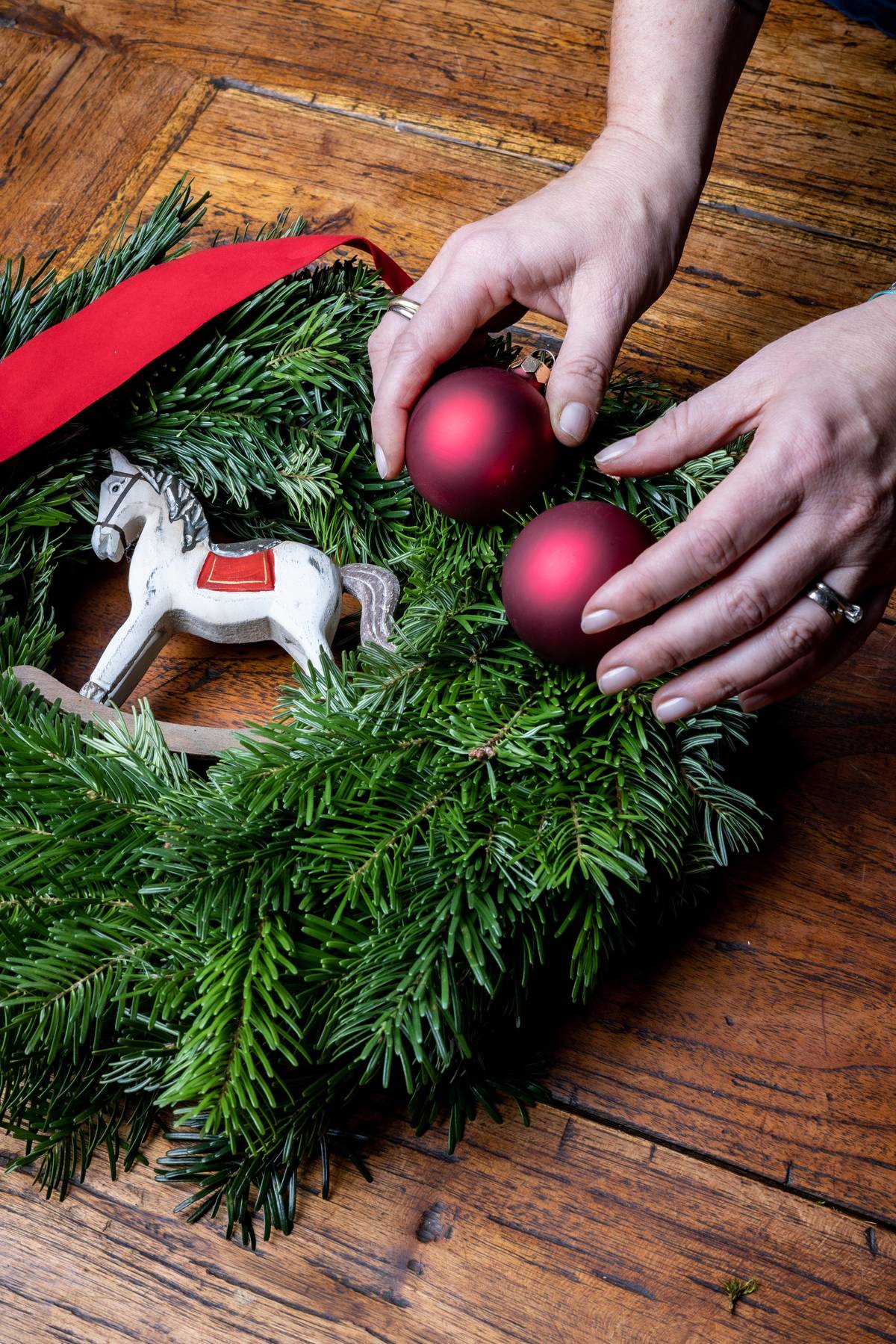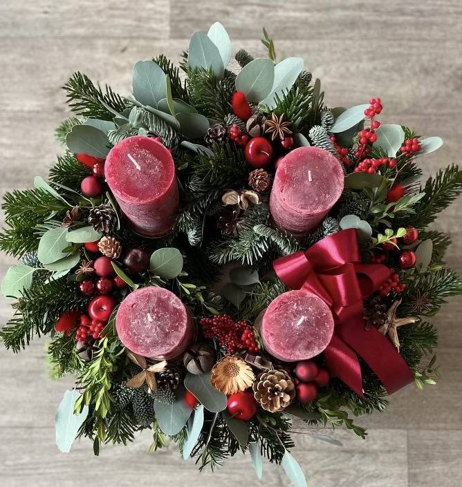 Tradiční vánoční věnec s červenými svíčkami doplňují červené mašle a červené plody.