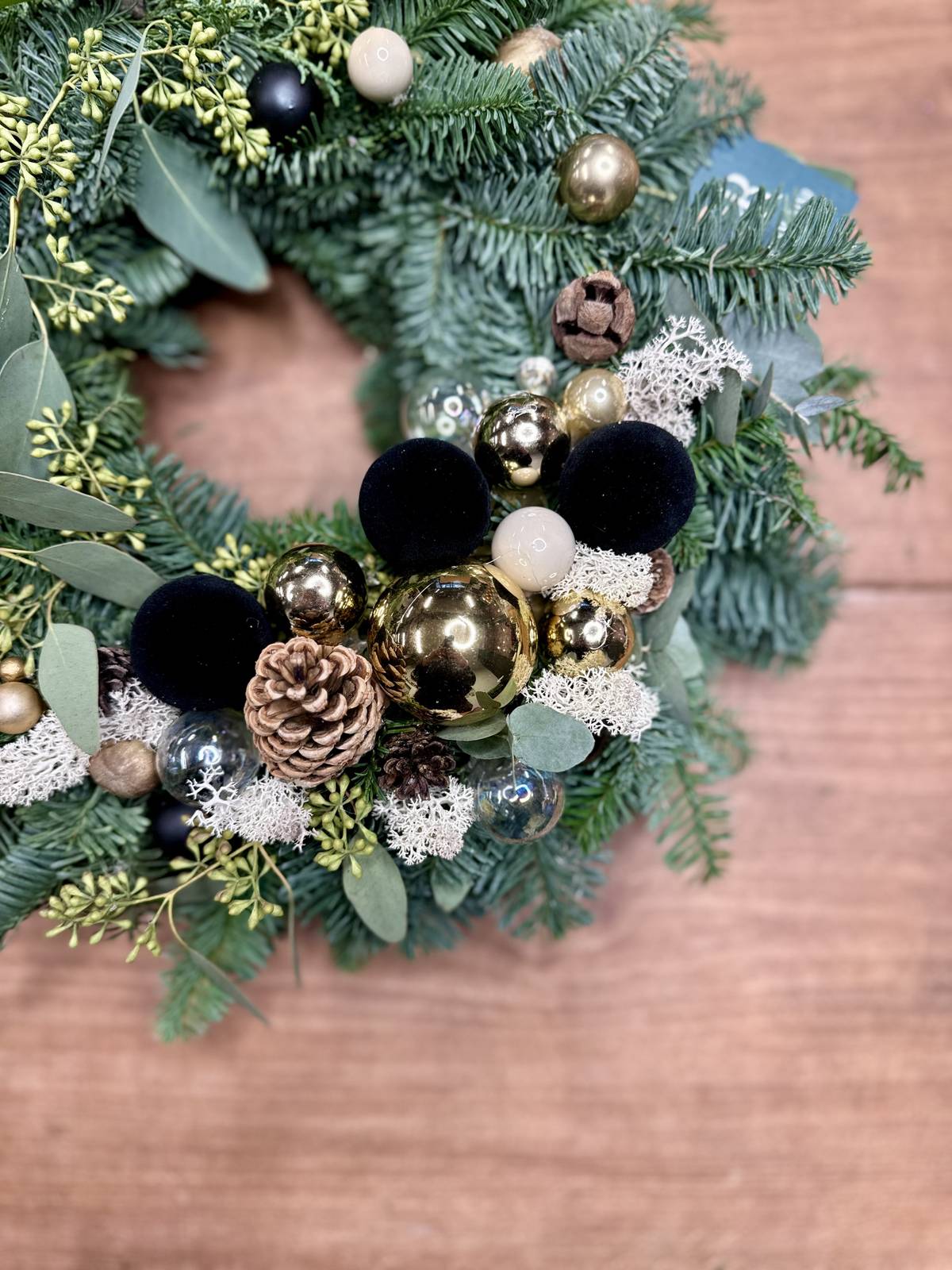 Věnec na venkovních dveřích. Základ je z pistácie, eukalyptu, dozdobený je látkovými květinami. Dotek Vánoc mu dávají skleněné kuličky.