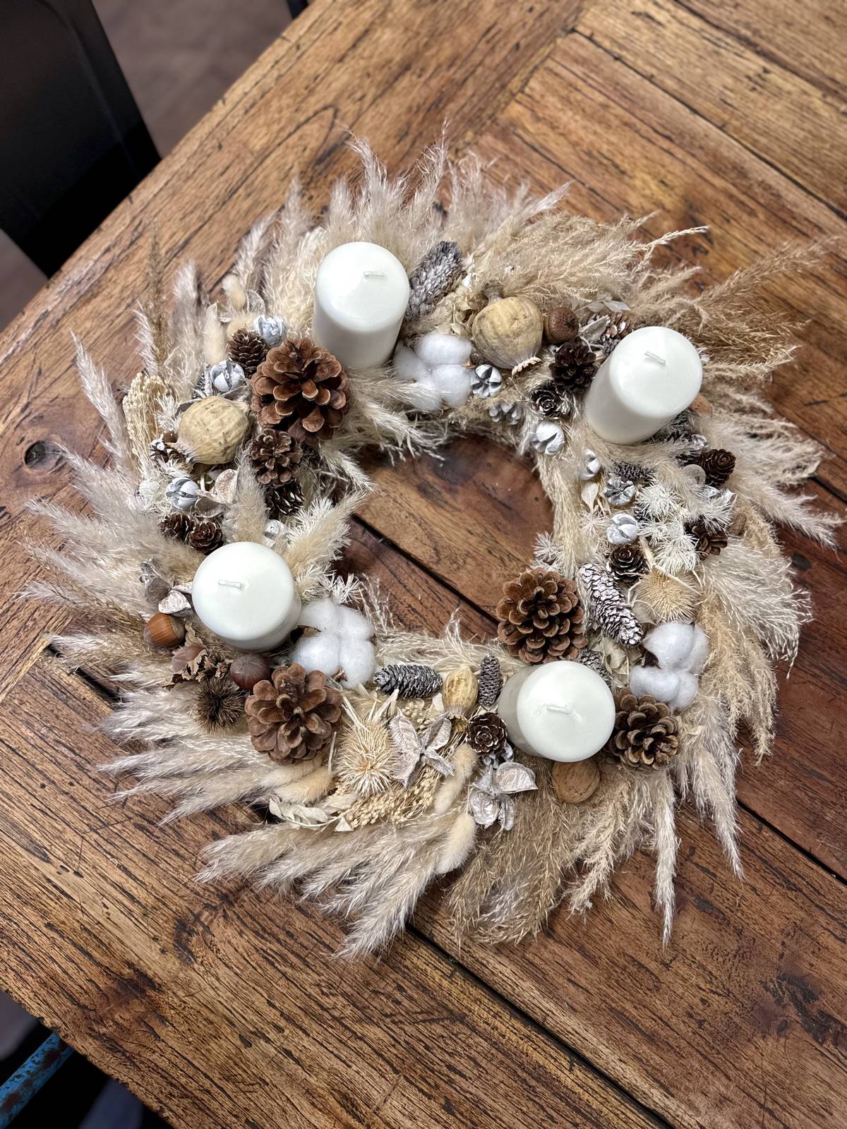 Kdo má rád jemný a decentní věnec, zaujme ho atraktivní kombinace sušené pampy a šišek.