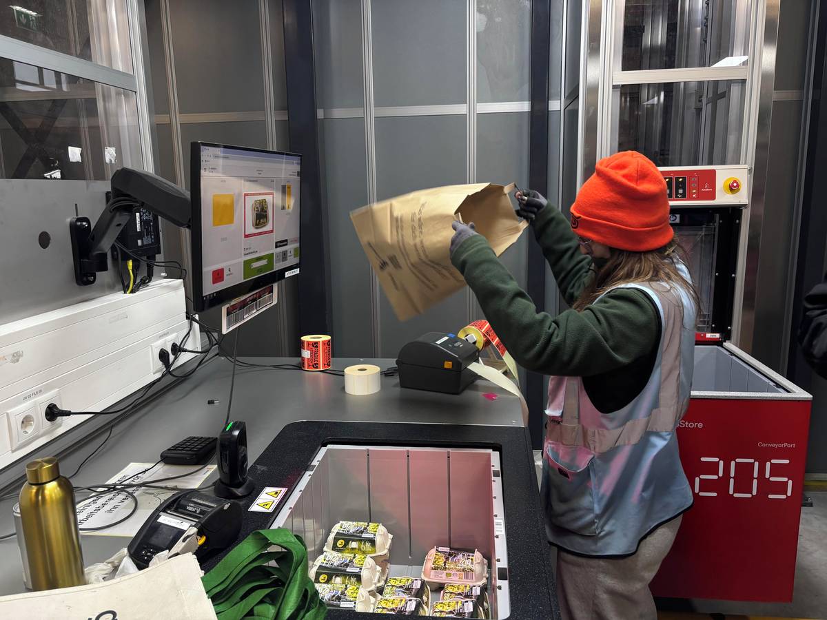 Pracovník vyrovnává tašky na regál, odkud si je převezme kurýr.