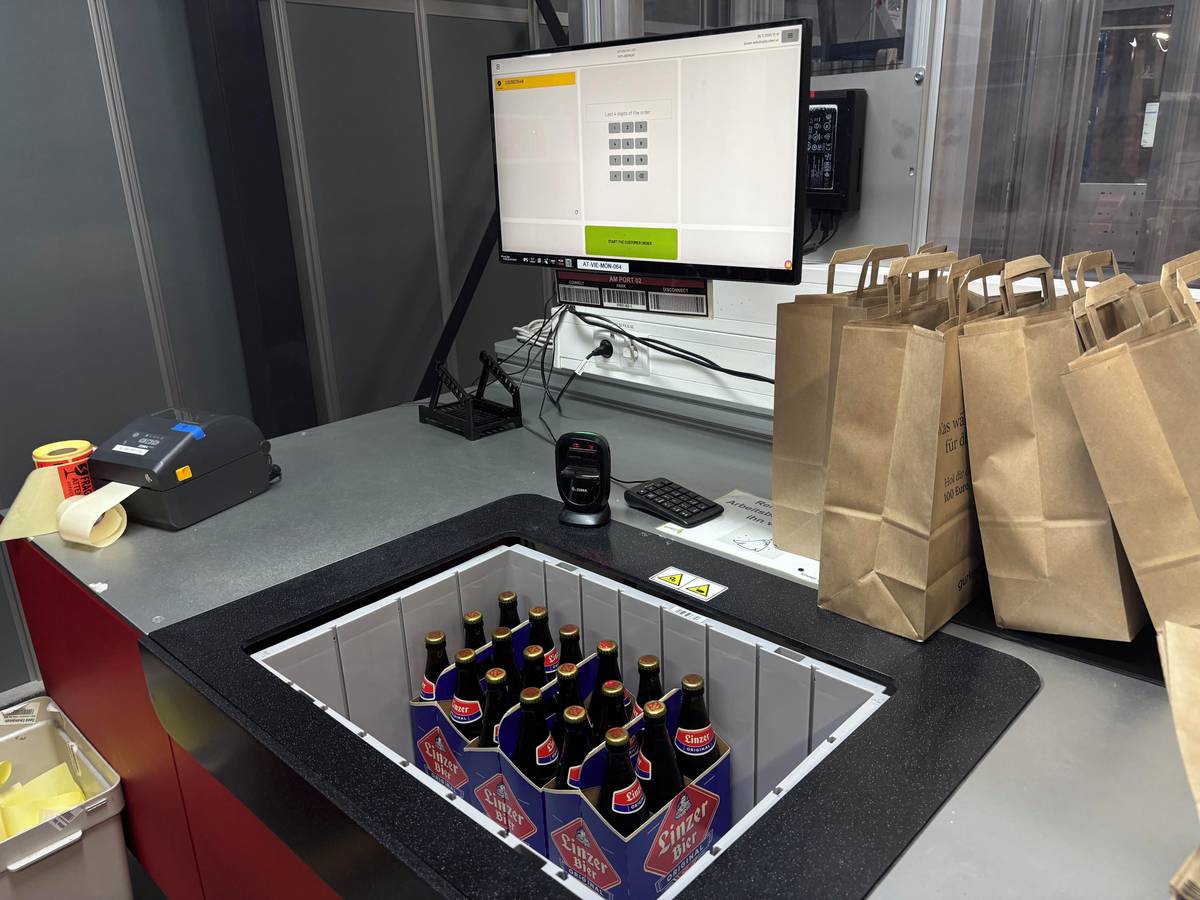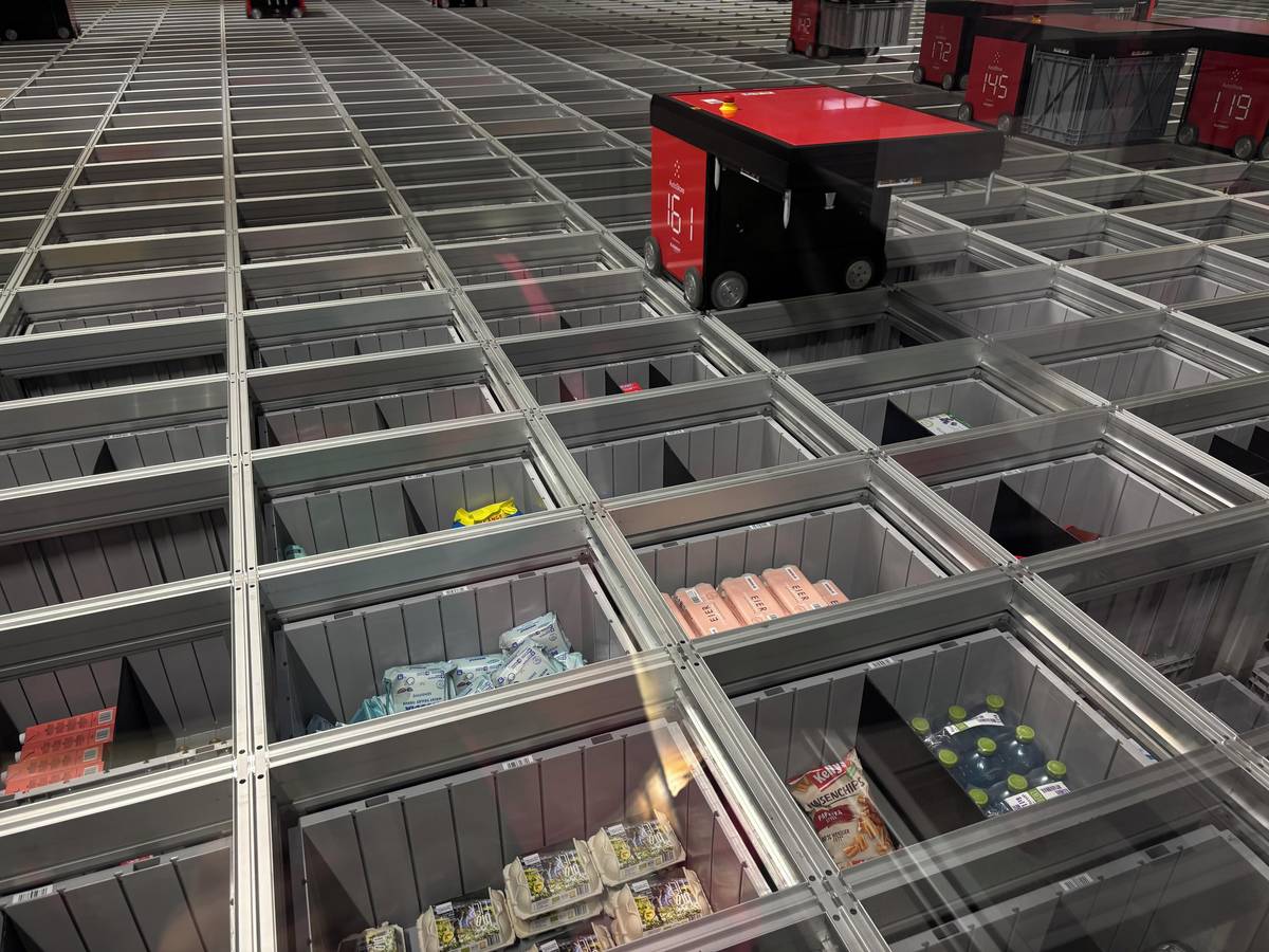 Robot hledá, ve které z přepravek je požadované zboží. Může se stát, že je zandaná pod jinou - pak mu pomohou robotičtí kolegové.