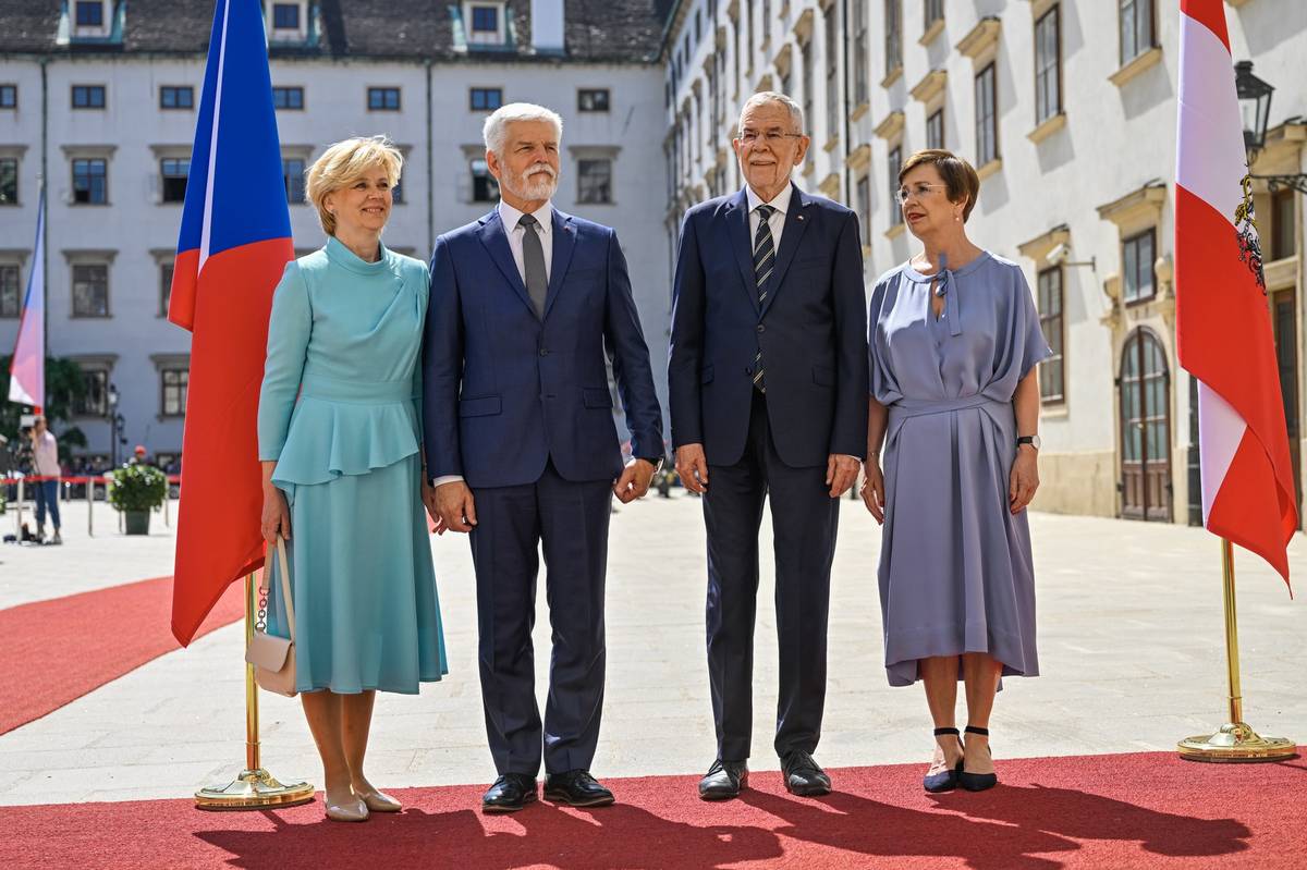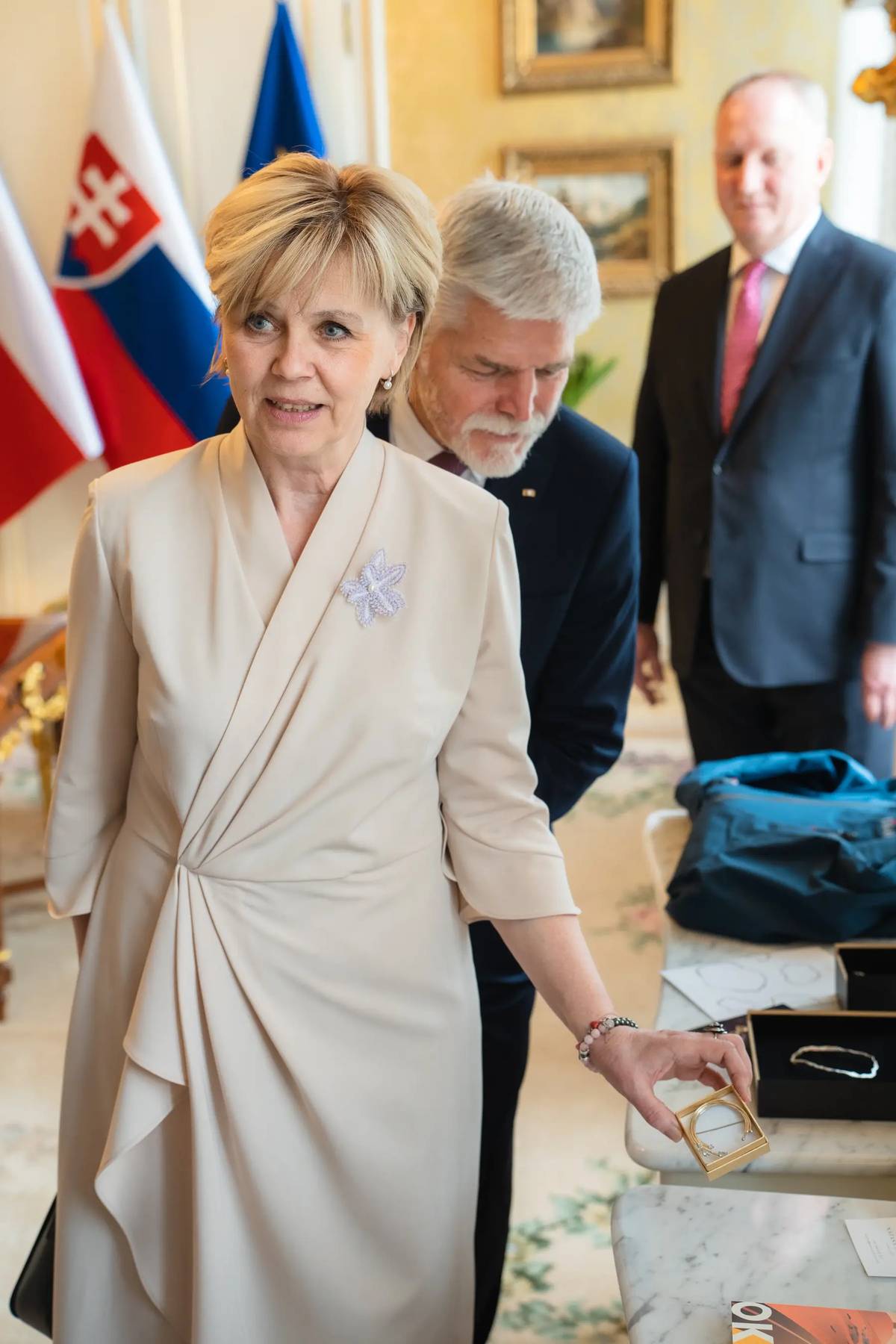 Březen 2023. První kroky prezidentského páru vedly na Slovensko, kde se setkal s prezidentkou Zuzanou Čaputovou a jejím partnerem Jurajem Rizmanem. Eva Pavlová si oblékla krémové šaty, které pro ni vytvořila Lenka Bernardes