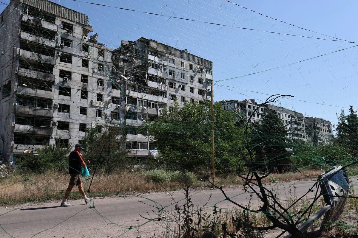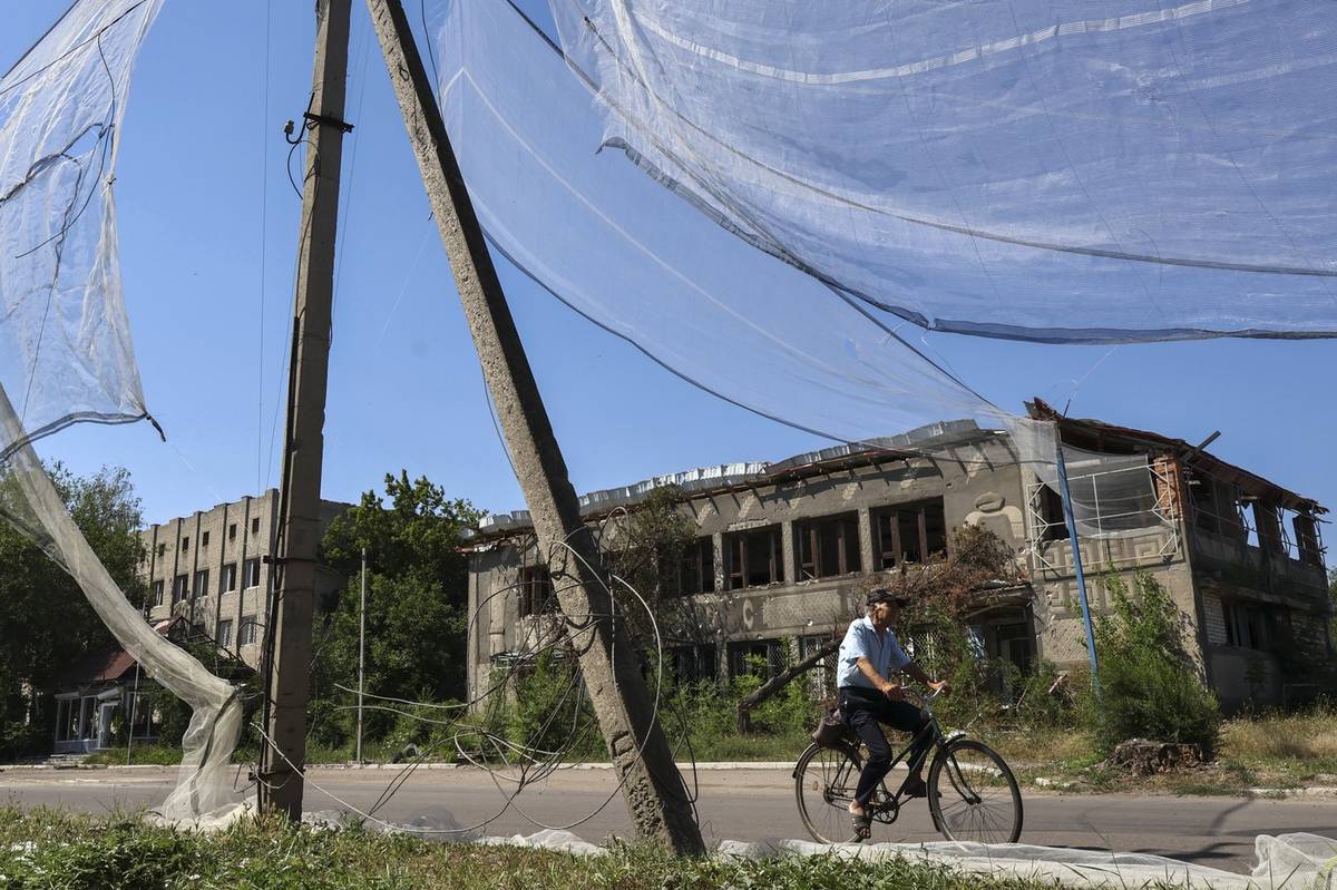 (Autobusová zastávka chráněná protidronovými sítěmi ve městě Orichiv v Záporožské oblasti na Ukrajině, 15. července.)