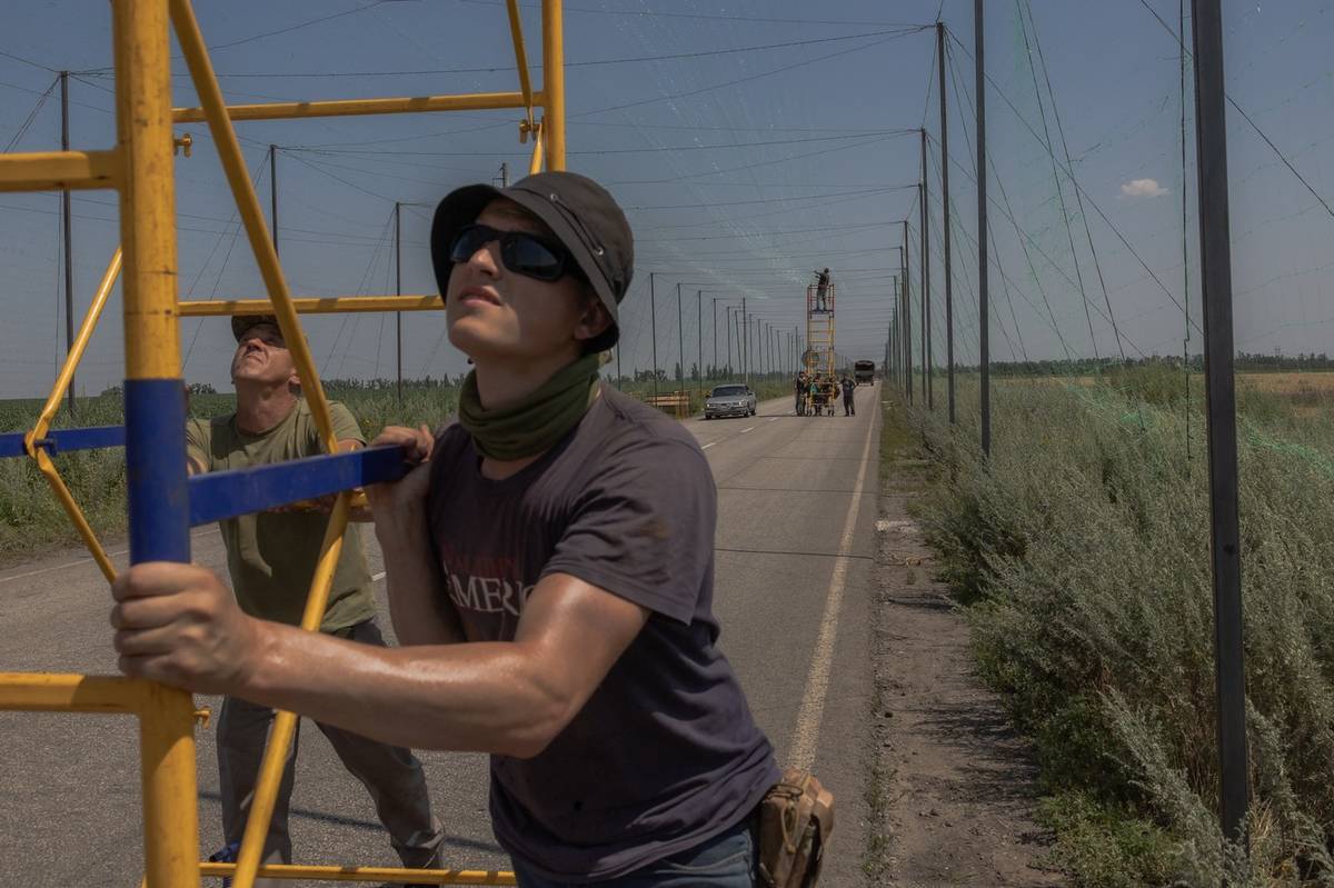 Na snímku probíhá instalace sítí podél cest, kudy se dováží zásoby na frontu. Drony zažily během války na Ukrajině boom, sítě kvůli této hrozbě instalují vojáci také na vojenská zařízení, jinde jim pomáhají snížit riziko speciální klece.