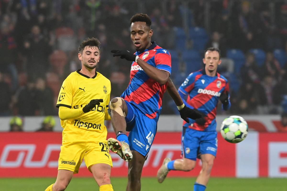 Záložník Bohemians Benson Sakala v silovém souboji s teplickým Náprstekem.