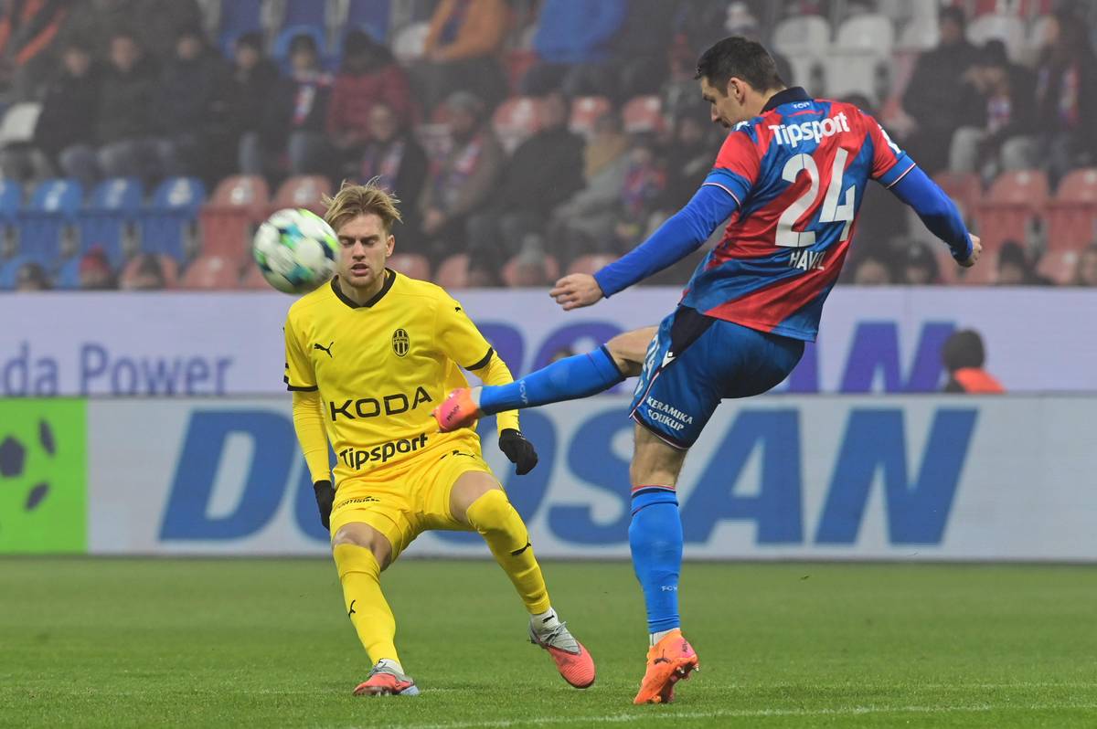 Plzeňský obránce Milan Havel odehrává míč před dotírajícím Martinem Šubrtem.