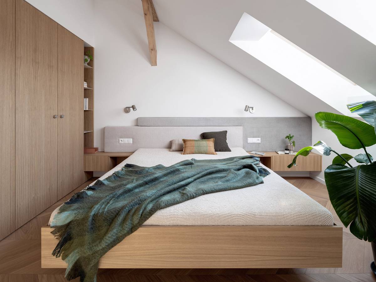 Šatní skříně z dubové dýhy navazují na noční stolky s měkkým polstrovaným čelem.