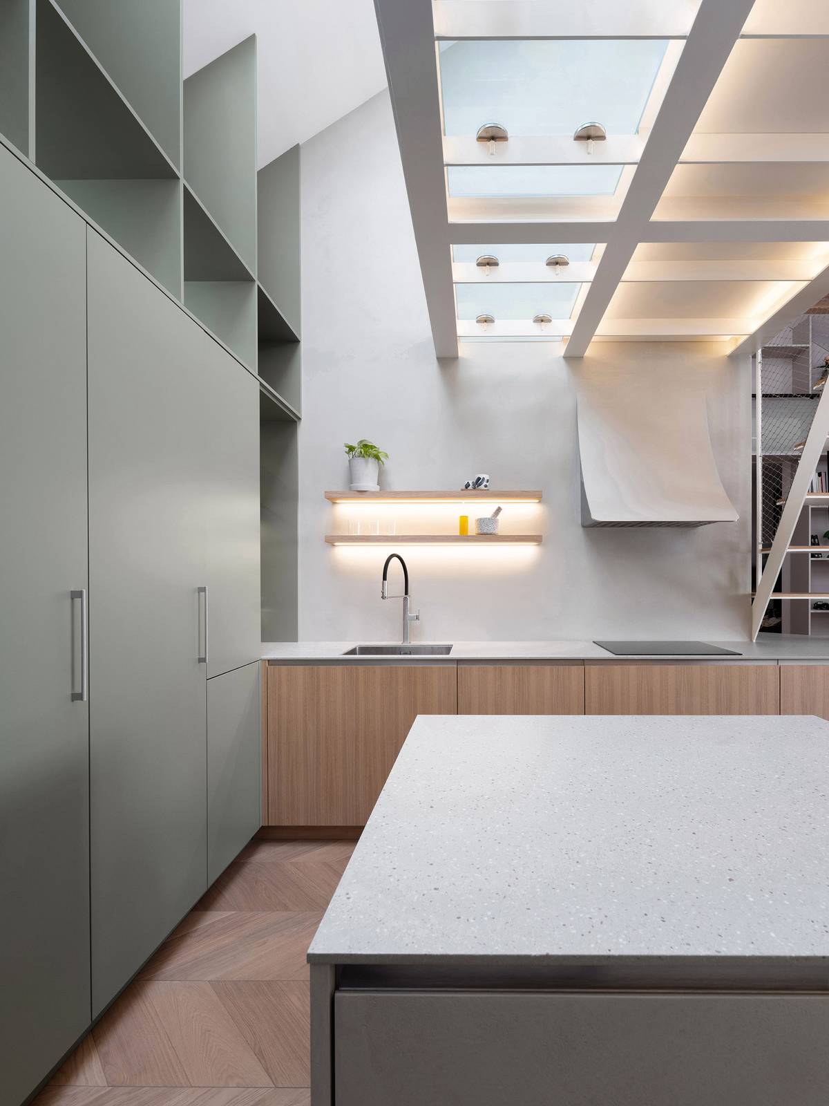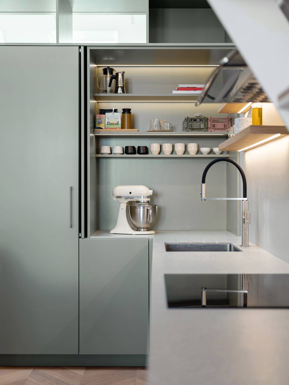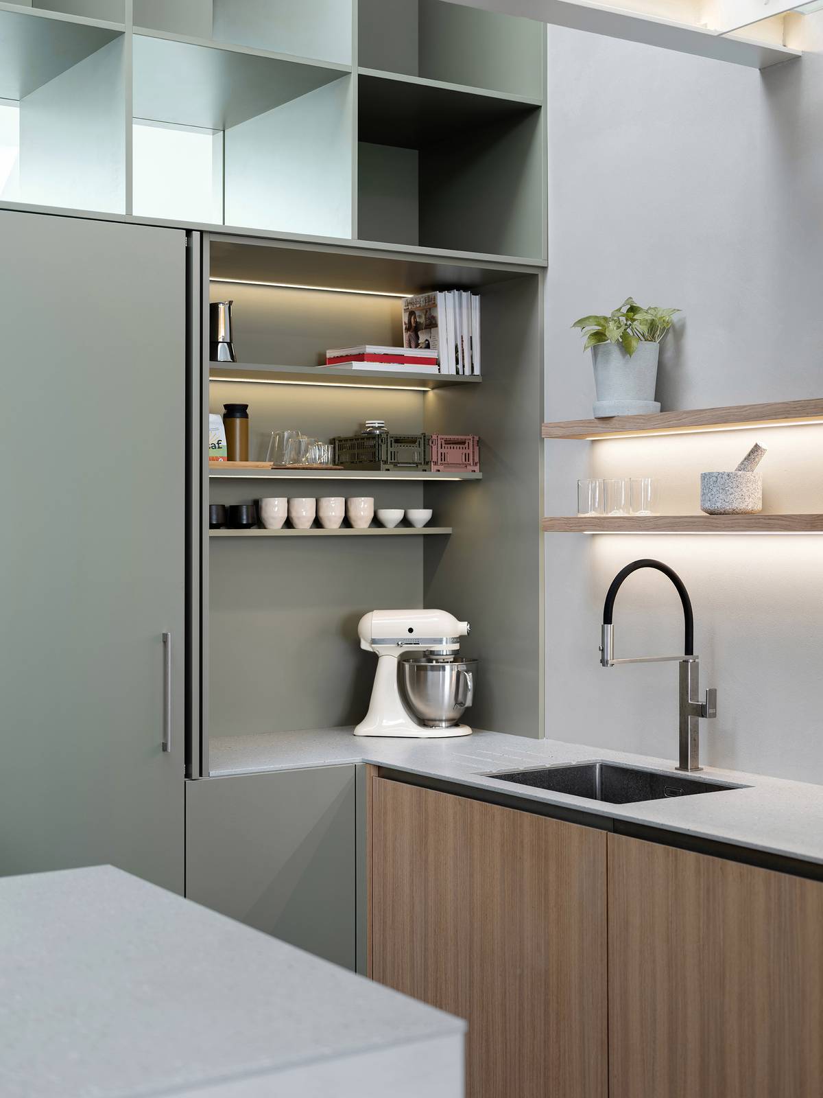 Kuchyňské skříně v tlumeně olivové barvě si rozumí se šedivou pracovní deskou. Doplňuje je decentní LED podsvícení dřevěných polic.