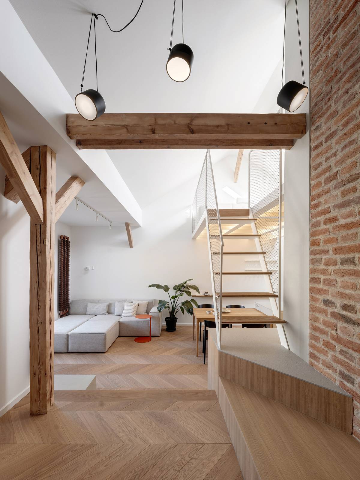 Hlavní obytná místnost byla díky své výšce a prosvětlení střešními okny ideálním kandidátem na vložení patra, které však nesmělo zastínit podlaží pod ním.