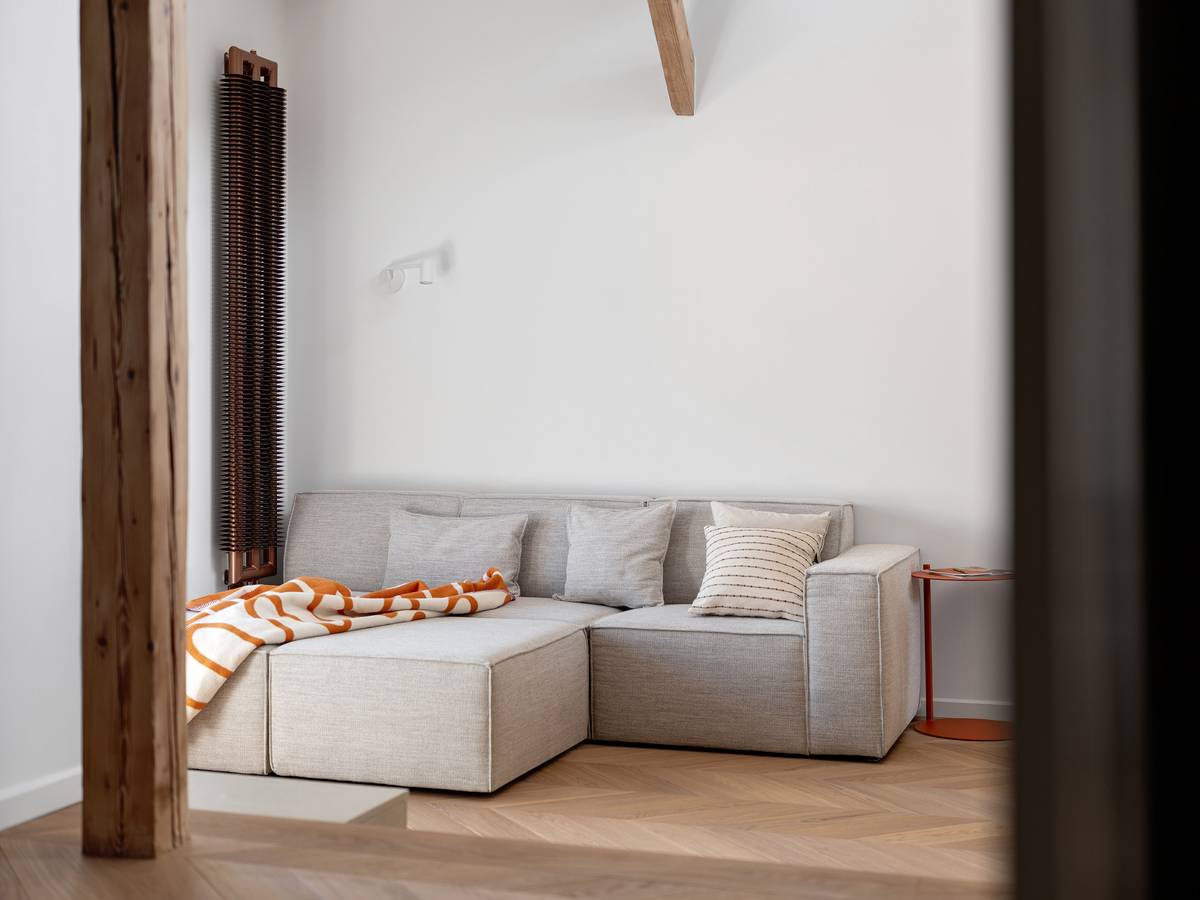 Původní francouzské okno na terasu architekti nahradili okny posuvně zdvižnými. Díky tomu dveřní křídlo nezasahuje do prostoru obýváku a bylo možné umístit pohovku až ke stěně.