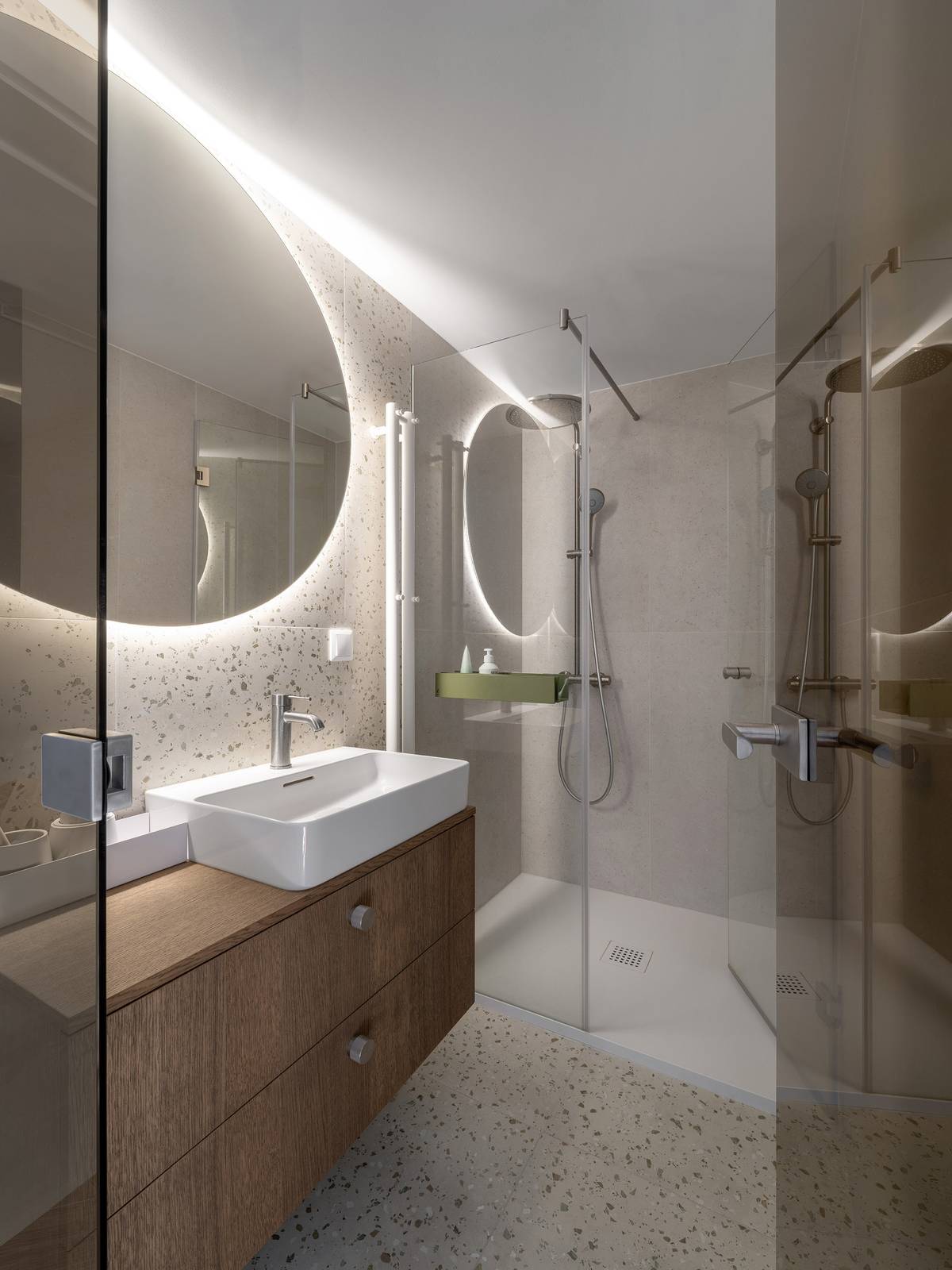 Druhá koupelna v bytě má terrazzo dekor na podlaze a na obkladu vany. Součástí místnosti je i toaleta.