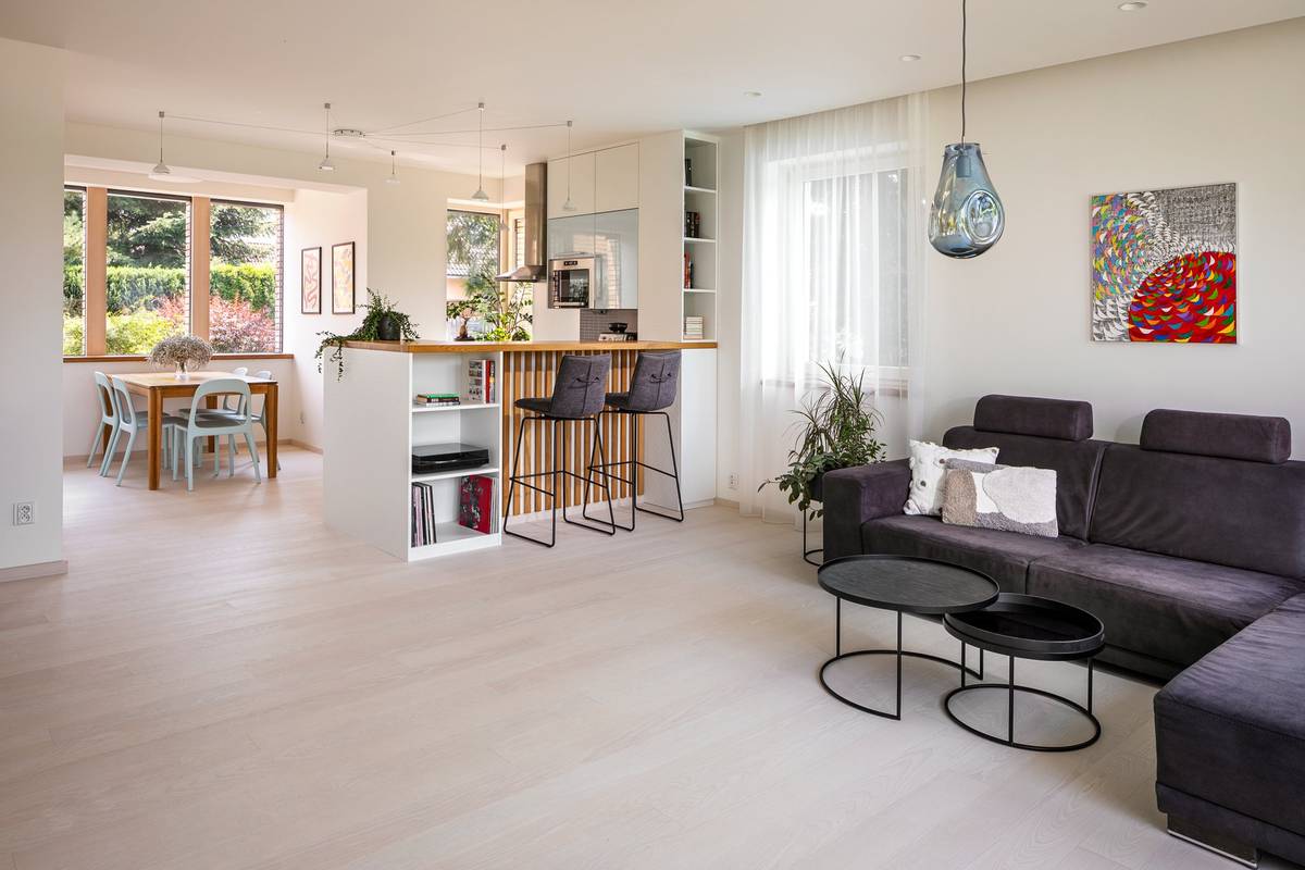 Z kuchyně je výhled na obývací pokoj a do zahrady.