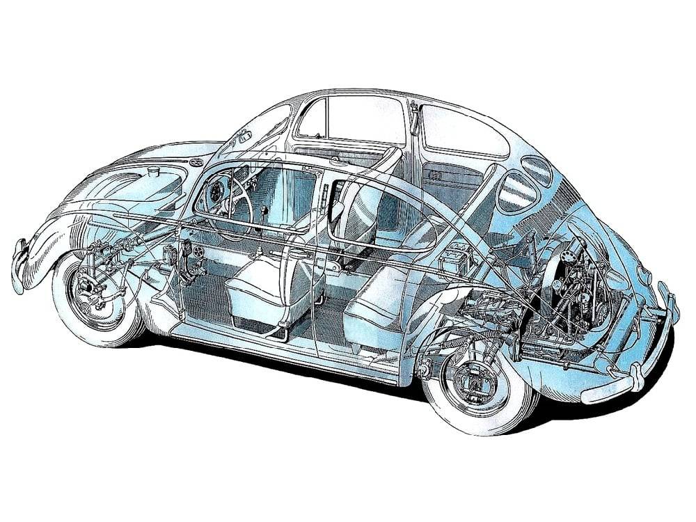 Rentgenová kresba ukazuje geniální konstrukci. Jedná se o jeden z prvních ročníků ještě s děleným zadním oknem, díky němuž se vozu přezdívalo „Brezelkäfer“ (Brezel = preclík)