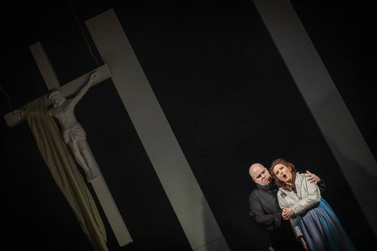 Na fotografii z inscenace Toscy, která má tento pátek premiéru v libereckém Divadle F. X. Šaldy, jsou Eduard Martyniuk jako Cavaradossi a Lívia Obručník Vénosová v roli Toscy.