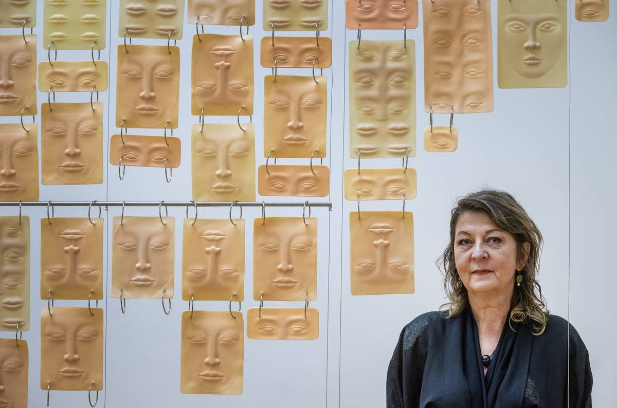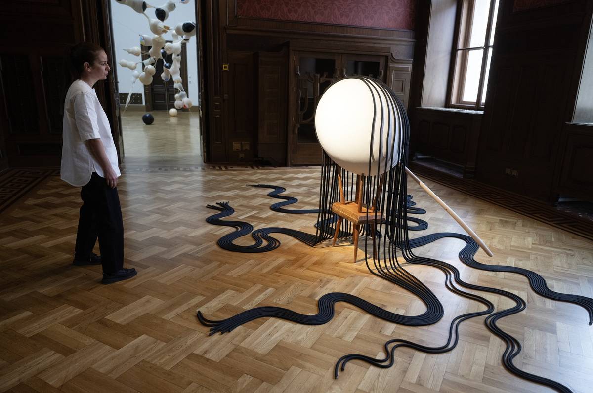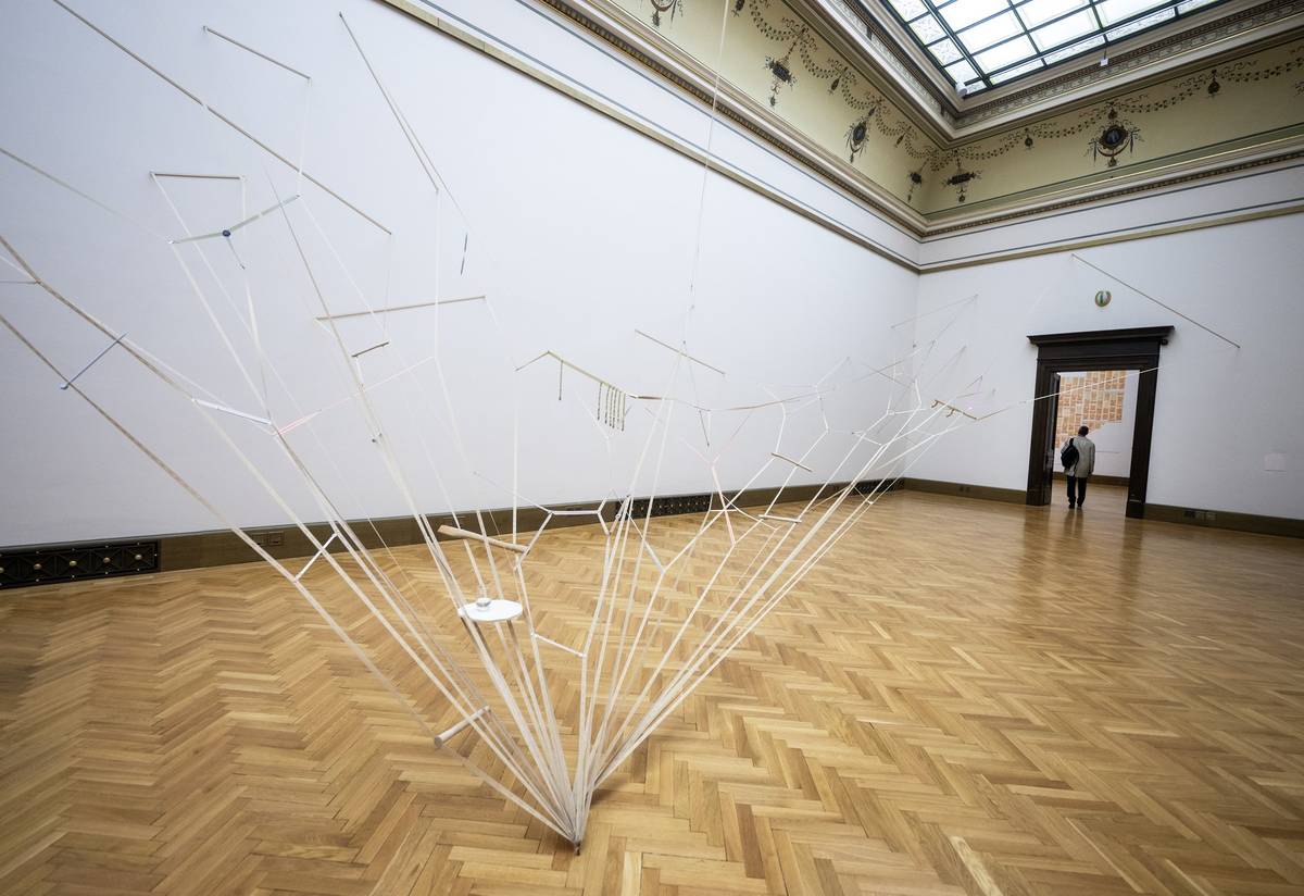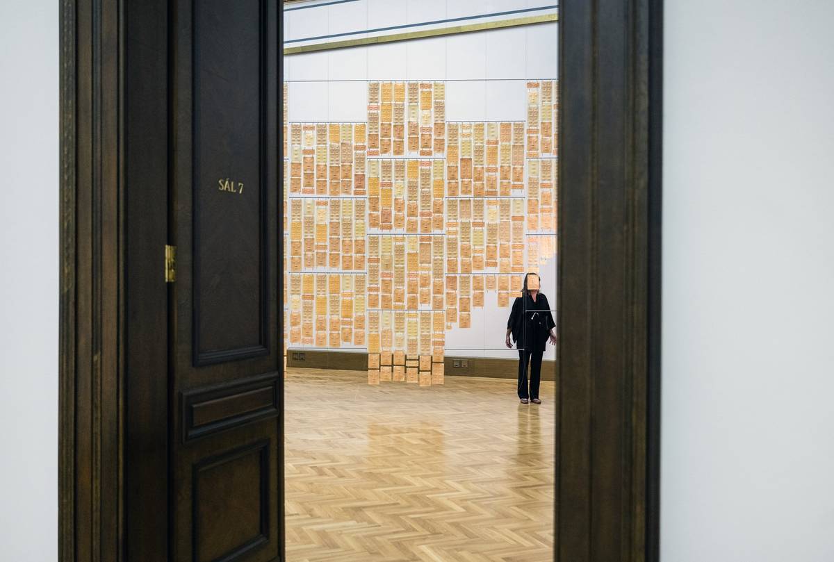 Na fotografii z výstavy děl Kateřiny Vincourové, která v pražské Galerii Rudolfinum potrvá do 4. ledna, si návštěvnice prohlíží dílo Molekuly z roku 2006.