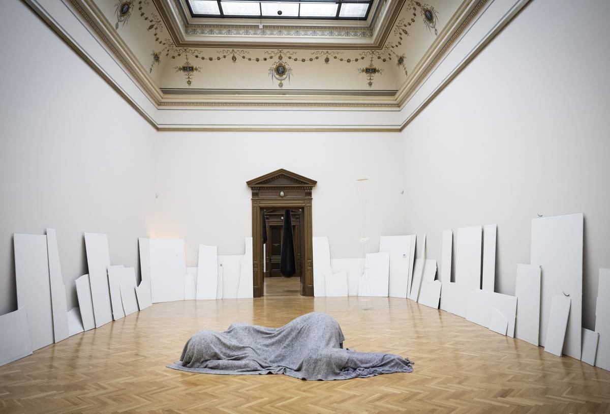 Uprostřed leží obryně zakrytá šedivou dekou a nazvaná S_ní, po obvodu místnosti je instalace Všechna včera.