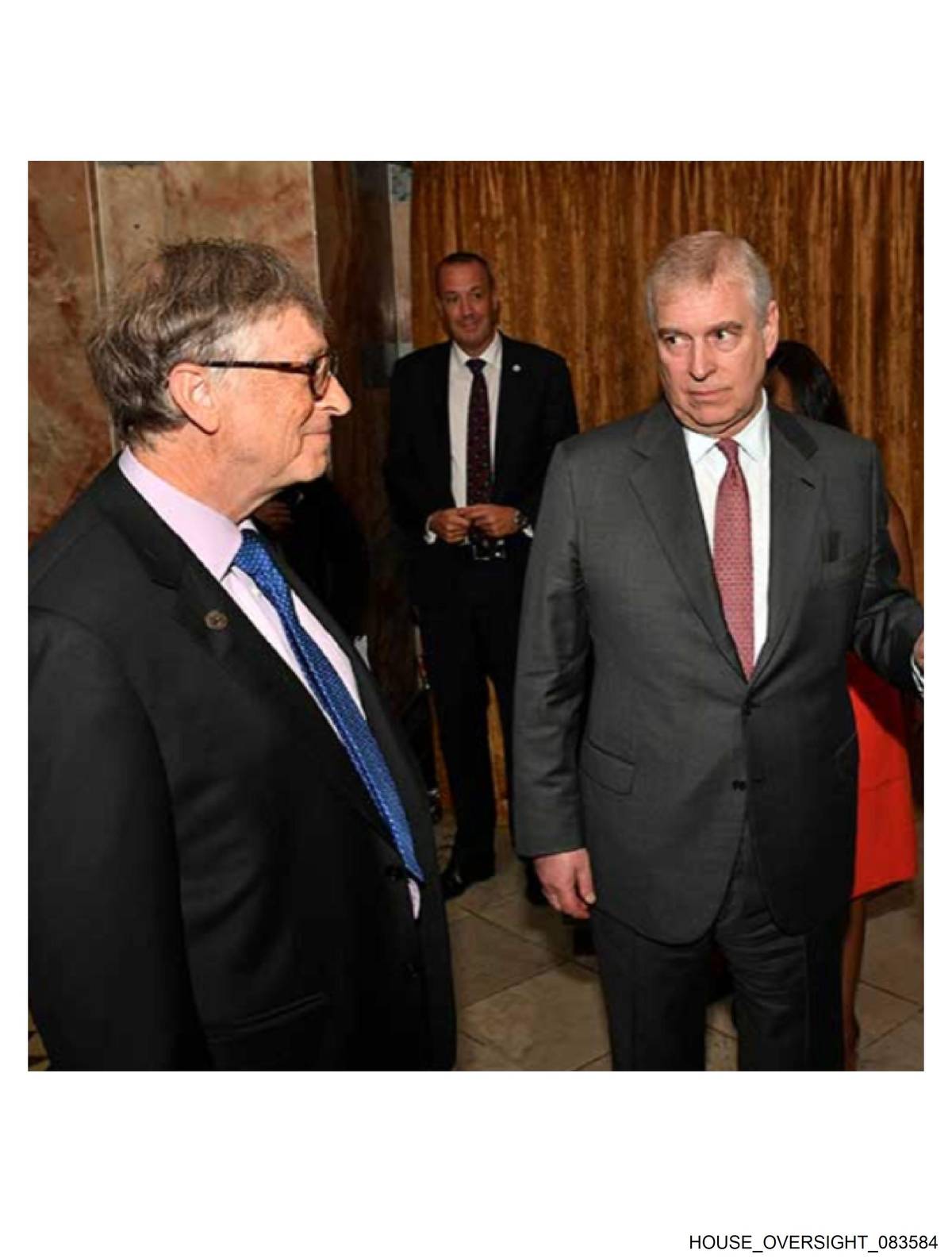 Bill Gates (vlevo) a bývalý princ Andrew (vpravo). Na původní fotce stojí vedle Andrewa také současný britský král Karel III.